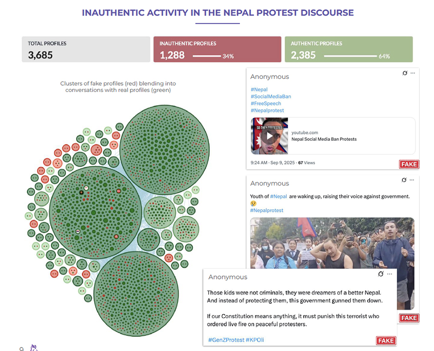 इजरायलको तेलअभिभमा रहेको साइबर इन्टेलिजेन्स कम्पनी सायाब्राले गरेको अनुसन्धानमा नेपालमा हालै भएको जेनजी विद्रोहमा वास्तविक प्रयोगकर्तासँग मिसिएर जेनजी प्रोटेस्ट, वेकअप नेपालजस्ता ह्यासट्याग प्रयोग गर्दै आन्दोलनलाई अतिवादी र हिंसात्मक बनाउने दिशामा धकेल्न केही नक्कली प्रयोगकर्ताहरूले भूमिका खेलेको प्रतिवेदनमा उल्लेख छ ।