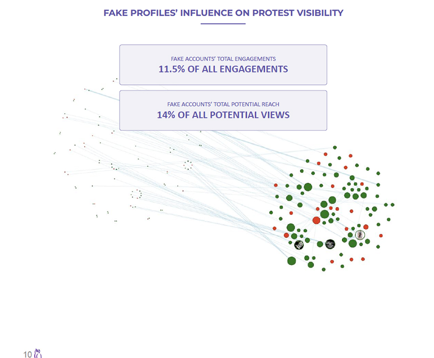 अनलाइन चर्चामा नक्कली प्रोफाइलहरूको महत्त्वपूर्ण उपस्थिति रहेको प्रतिवेदनमा उल्लेख छ । उनीहरूले आक्रामक विरोधका सन्देशलाई व्यापक बनाउन भूमिका खेले ।