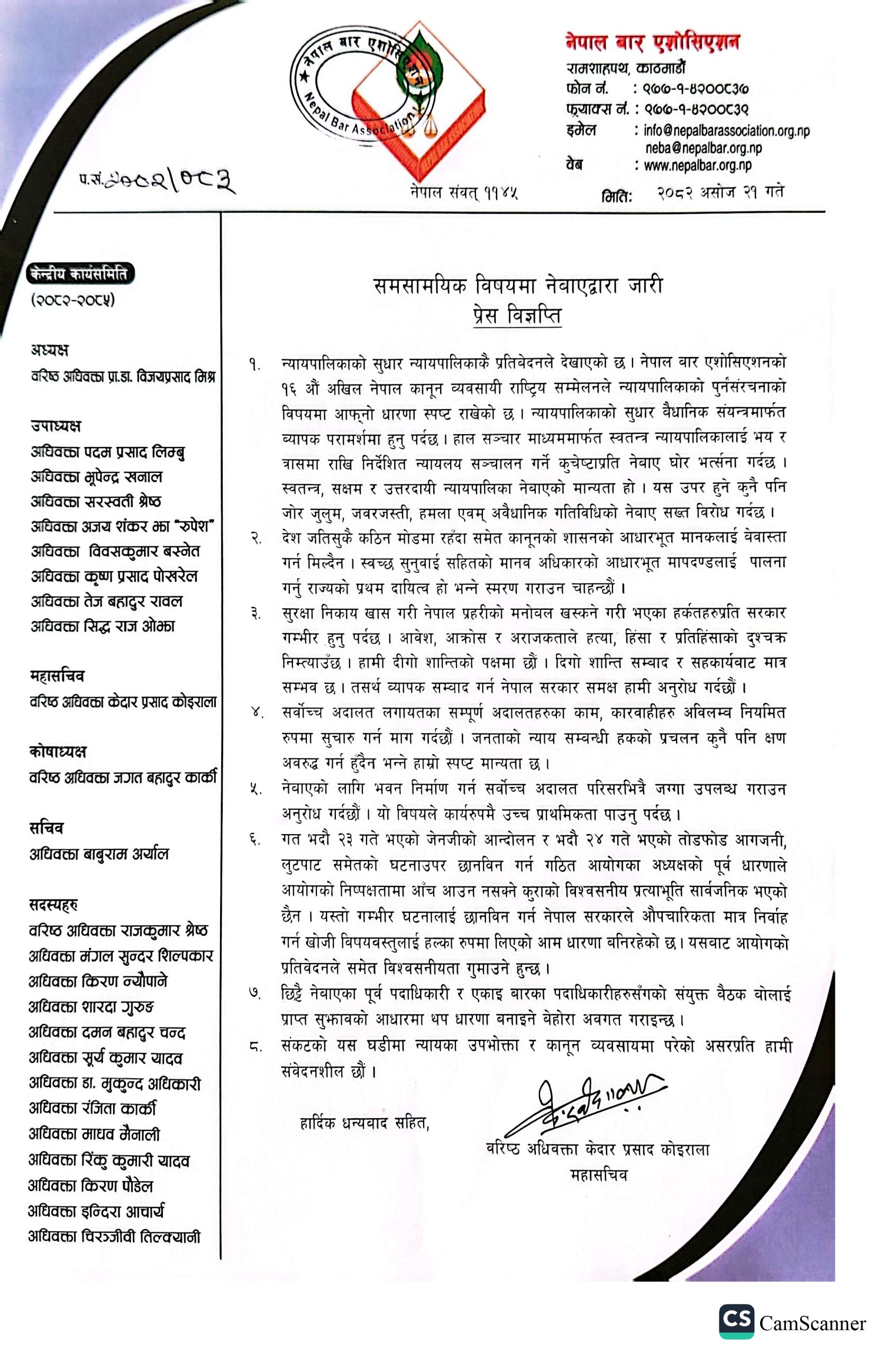 ‘सुरक्षा निकाय खास गरी नेपाल प्रहरीको मनोबल खस्कने गरी भएका हर्कतहरुप्रति सरकार गम्भीर हुनु पर्दछ । आवेश, आक्रोस र अराजकताले हत्या, हिंसा र प्रतिहिंसाको दुश्चक निम्त्याउँछ,’ बारले जारी विज्ञप्तिमा भनेको छ, ‘हामी दिगो शान्तिको पक्षमा छौं । दिगो शान्ति सम्बाद र सहकार्यबाट मात्र सम्भव छ । तसर्थ व्यापक सम्वाद गर्न नेपाल सरकार समक्ष हामी अनुरोध गर्दछौं ।’