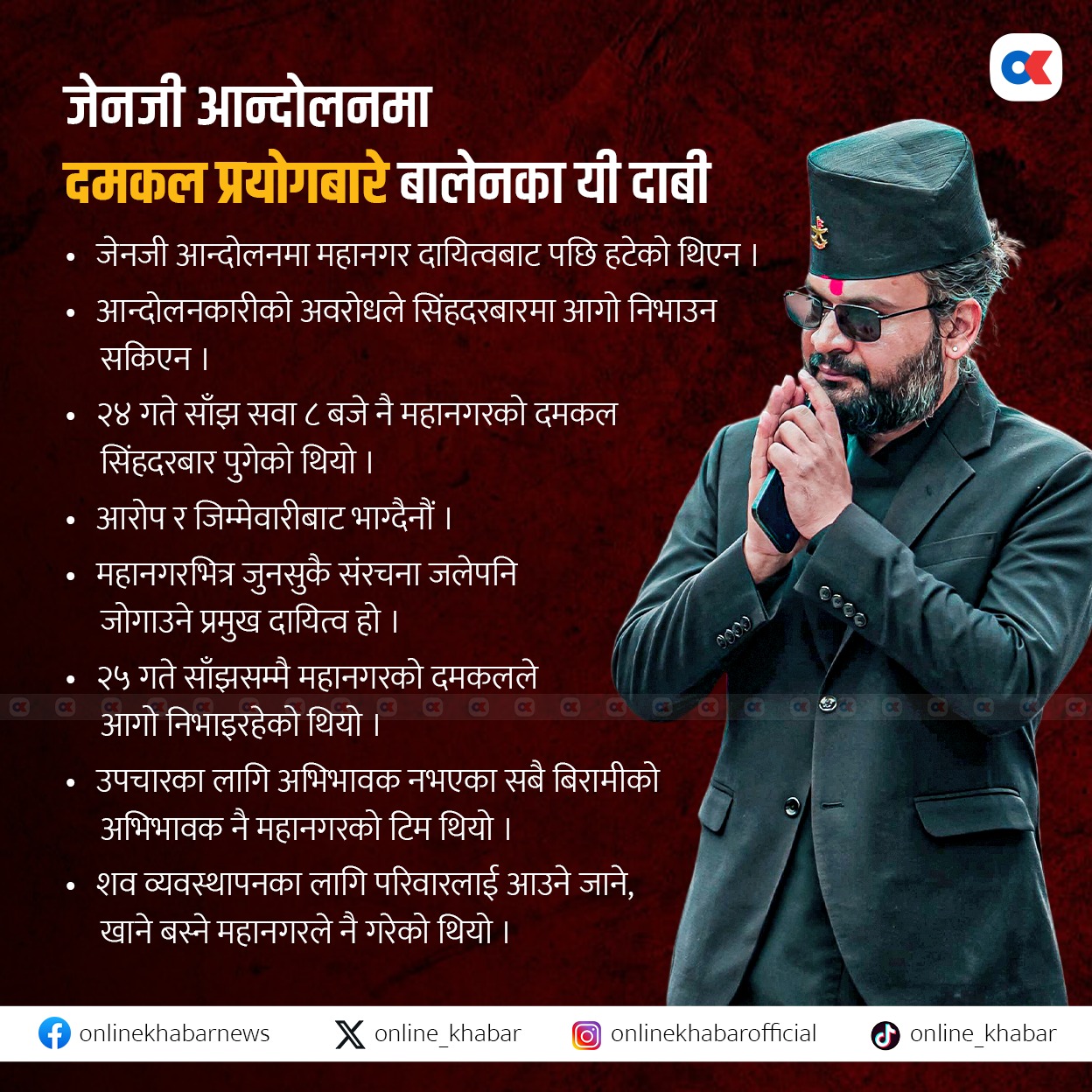 ‘दमकल ५/२३ गते दिउँसो १:३० देखि ५ बजेसम्म संसद् भवन अगाडि आगो लागिरहेको एम्बुलेन्समा न्युरोड र रामहिटी दमकलले आगो निभाइरहेको थियो,’ बालेनले भनेका छन्, ‘न्युरोडकै अर्को दमकलले सुन्धारा र शान्तिनगर बिजुलीको पोलमा आगो निभाइरहेको थियो ।’
