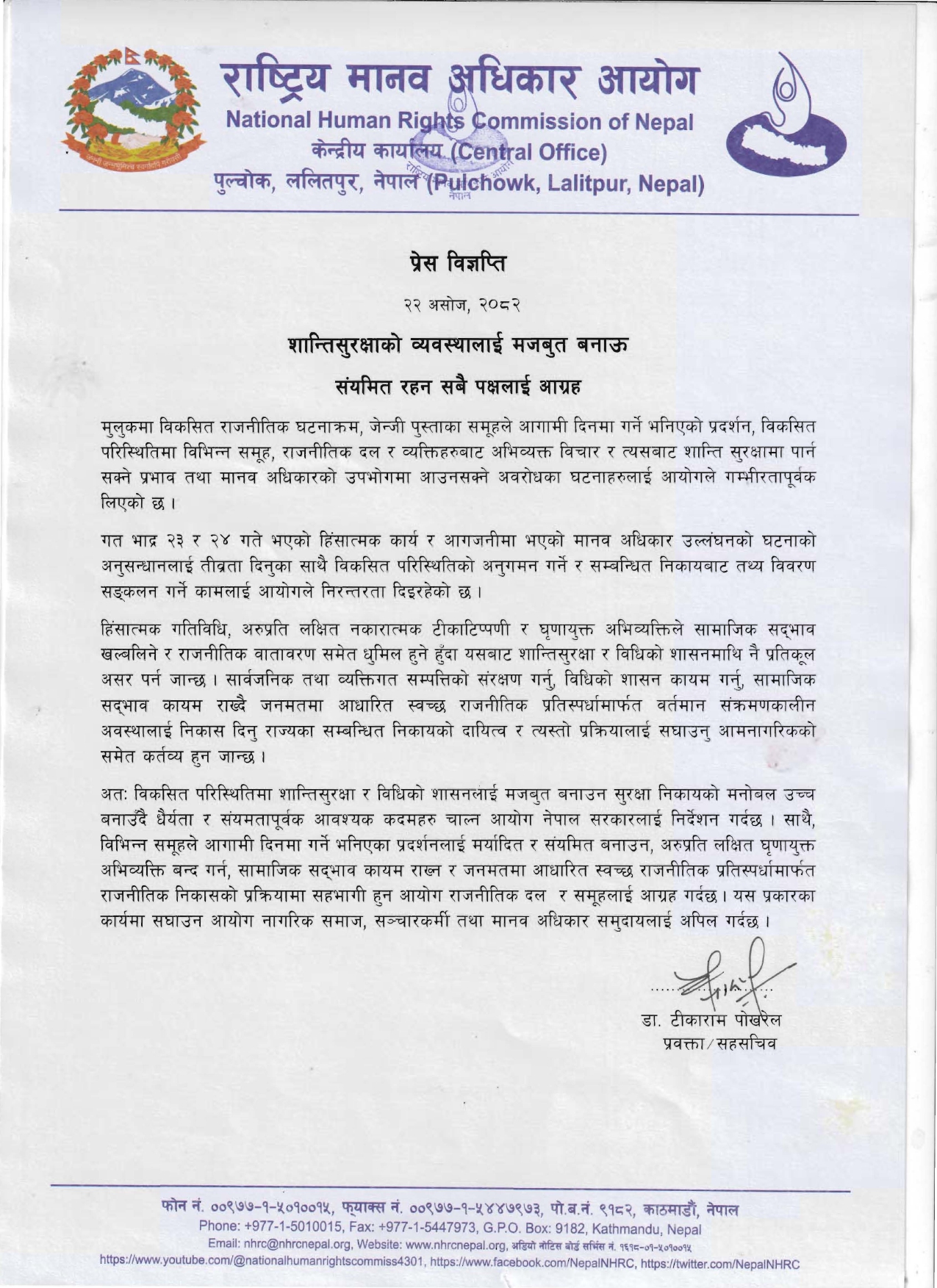 २२ असोज, काठमाडौं । राष्ट्रिय मानव अधिकार आयोगले सरकारलाई शान्ति सुरक्षा बलियो बनाउन र सबै पक्षलाई संयमित रहन आग्रह गरेको छ ।