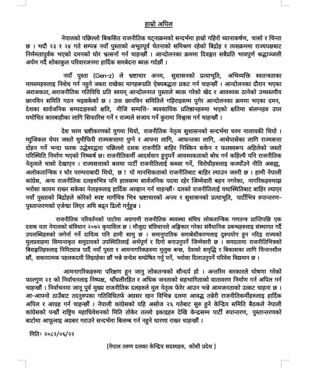 - तरुण दलले जेनजी आन्दोलनका क्रममा सार्वजनिक तथा निजी सम्पत्तिमा क्षतिबारे छानबिन गरी दोषीमाथि कारबाही गर्न आग्रह गरेको छ।