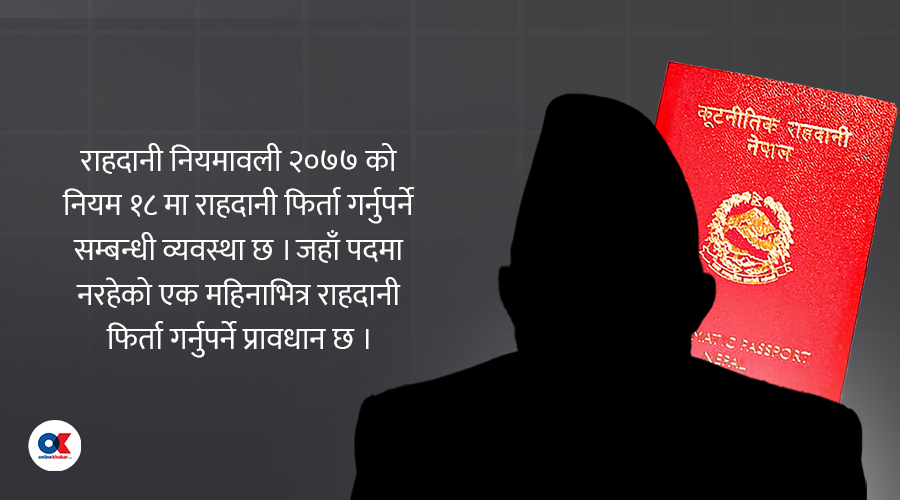 ‘कूटनीतिक वा विशेष राहदानी प्राप्त सरकारी पदमा रहेको व्यक्ति कुनै कारणले आफ्नो पदबाट अलग भएमा आफू पदबाट अलग भएको र विदेशमा रहेको भए नेपाल फर्किएको मितिले एक महिनाभित्र आफ्नो र आफ्नो परिवारका सदस्यको नाममा जारी भएको कूटनीतिक वा विशेष राहदानी विभागमा फिर्ता गर्नु पर्नेछ,’ नियम १८ को उपनियम १ मा छ ।