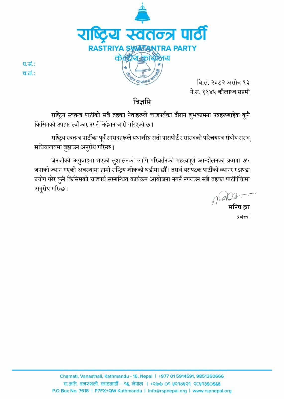 राष्ट्रिय स्वतन्त्र पार्टी (रास्वपा)ले पार्टीका तर्फबाट विघटित प्रतिनिधि सभामा रहेका सदस्यहरूलाई रातो पासपोर्ट र परिचयपत्र संसद् सचिवालयमा बुझाउन निर्देशन दिइसकेको छ ।