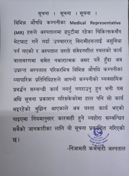‘अबदेखि अस्पताल परिसरमा कुनै पनि औषधि कम्पनीका प्रतिनिधिहरू आएर यस्ता कार्य गरेको पाइएमा नियमअनुसार कारबाही गरिनेछ,’ जारी सुचनामा भनिएको छ ।