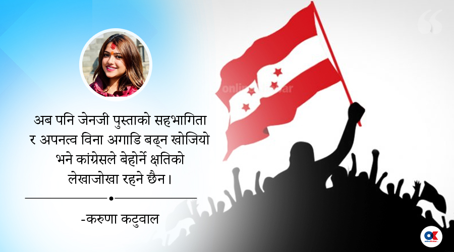 हरेक पार्टीमा जेनजी पुस्ताको प्रतिनिधित्व छ। नेपाली कांग्रेसमा पनि यो पुस्ता जबरजस्त कायम छ। पार्टीभित्रै रहेको यो पुस्तामा नेपाली कांग्रेसको विचार र सिद्धान्तलाई आत्मसात् गर्ने अठोट छ, कांग्रेस प्रति अपेक्षा छ, आशा छ अनि भरोसा पनि छ। समयानुसार नयाँ पुस्ताको माग अनुरूप अगाडि बढ्न नसक्नुका कारण आज कांग्रेस पार्टी ठूलो दुर्घटनामा परेको महसुस हुन थालेको छ। कांग्रेस राजनीतिक भागबन्डा र सत्तामोहमा लिप्त हुँदा देश गम्भीर सङ्कटमा फस्यो। पार्टीको नेतृत्वले महामन्त्रीद्वयको कुरा सुन्न चाहेको देखिएन। युवा महामन्त्रीहरूमा समेत नेतृत्वलाई धेरै प्रश्न गर्दा आफ्नो राजनीतिक भविष्यमा अवरोध आउँछ भन्ने मनोभावना जागेको हो कि भन्ने आशंका राख्ने प्रशस्त ठाउँ छन्।