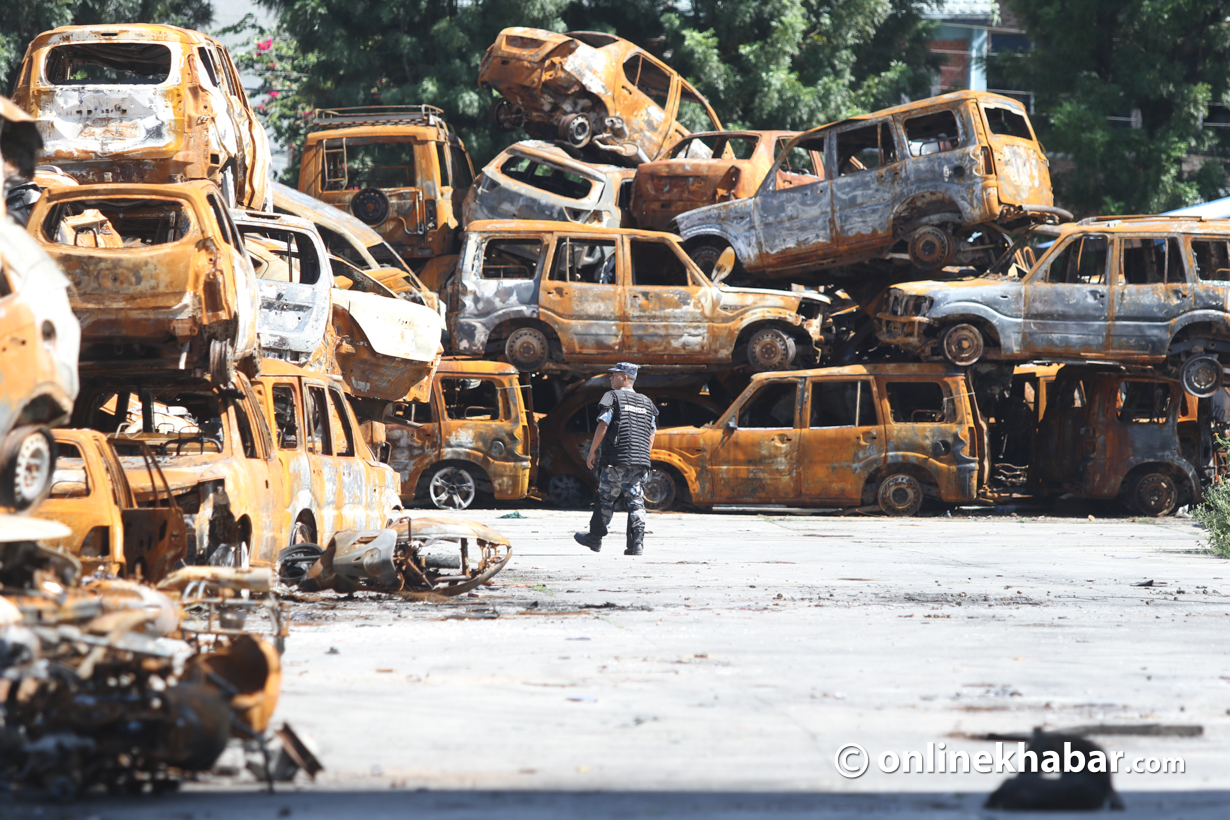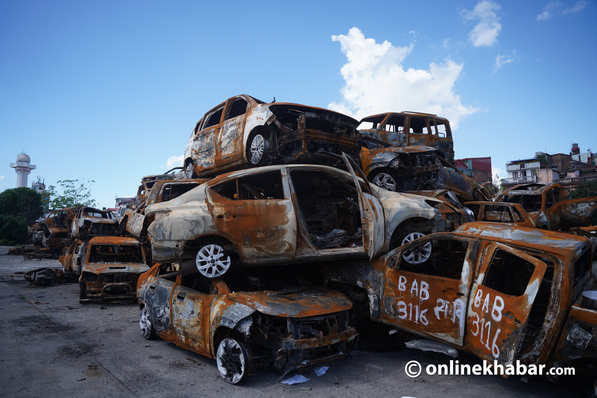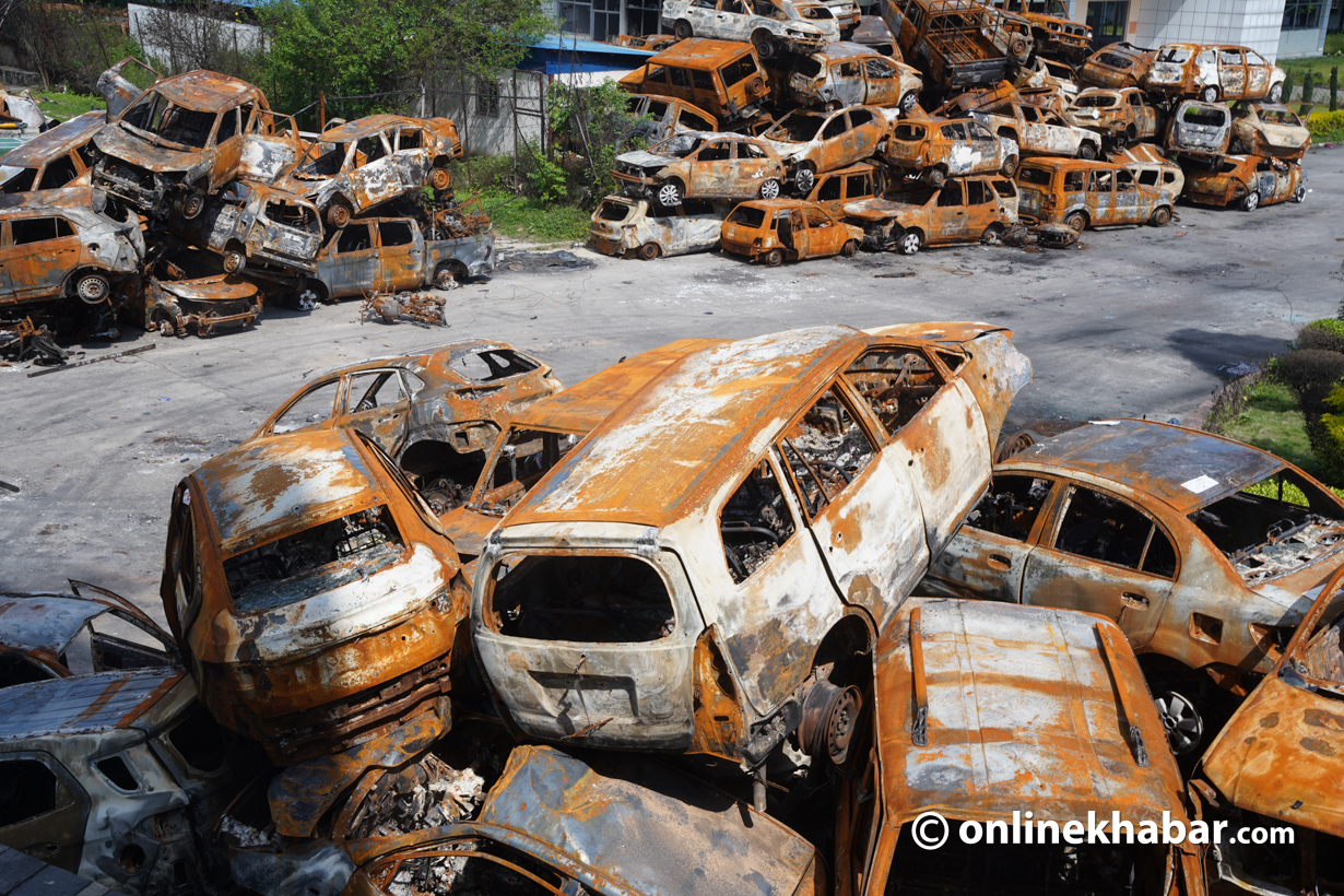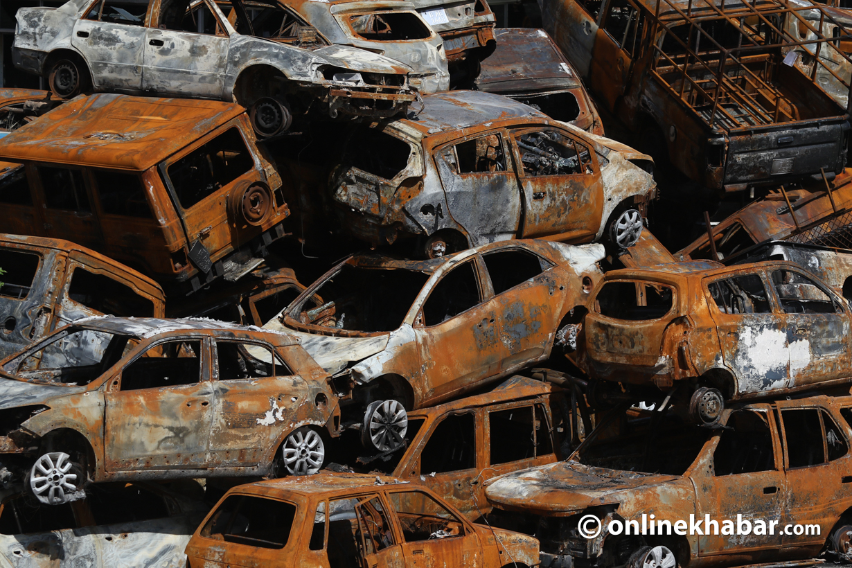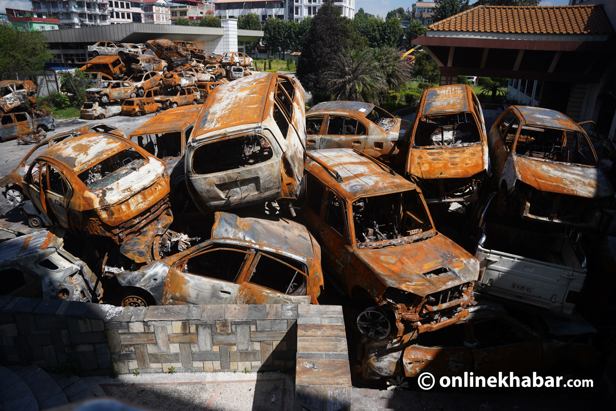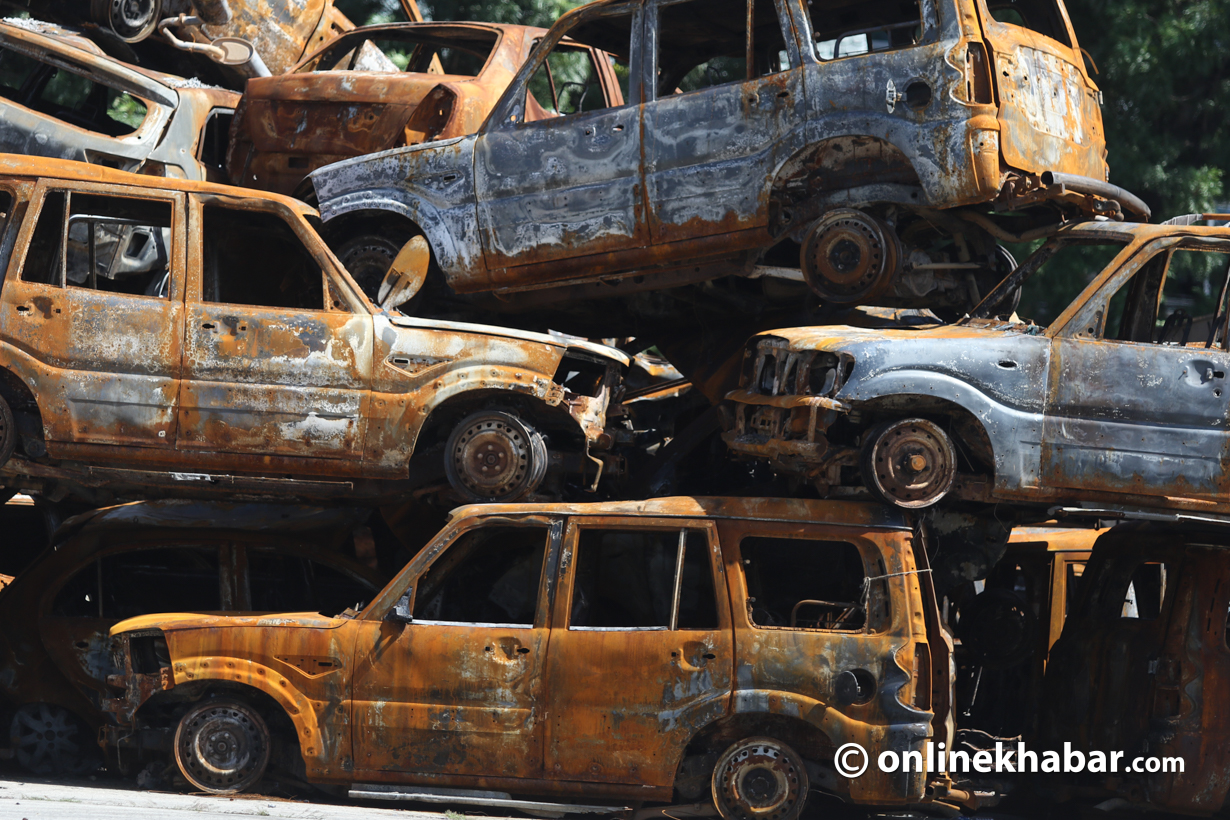 २३ असोज, काठमाडौं । गत २३ र २४ भदौमा भएको जेनजी आन्दोलनका क्रममा सिंहदरबार लगायत विभिन्न सरकारी कार्यालयमा जलाइएका गाडीहरू संघीय संसद् भवन परिसरमा लगेर राखिएको छ ।