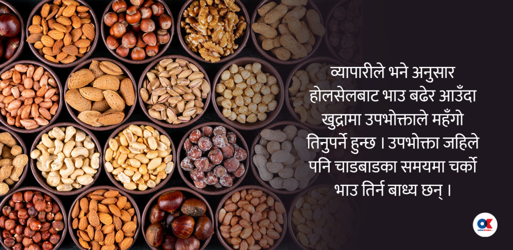 Generated by OK AI. Editorially reviewed.- तिहार आउन १२ दिन बाँकी रहँदा बजारमा ड्राइफ्रुट्सको भाउ बढेको छ र पिस्ता, ओखर, नरिवल, मखनाको मूल्य वृद्धि भएको छ।