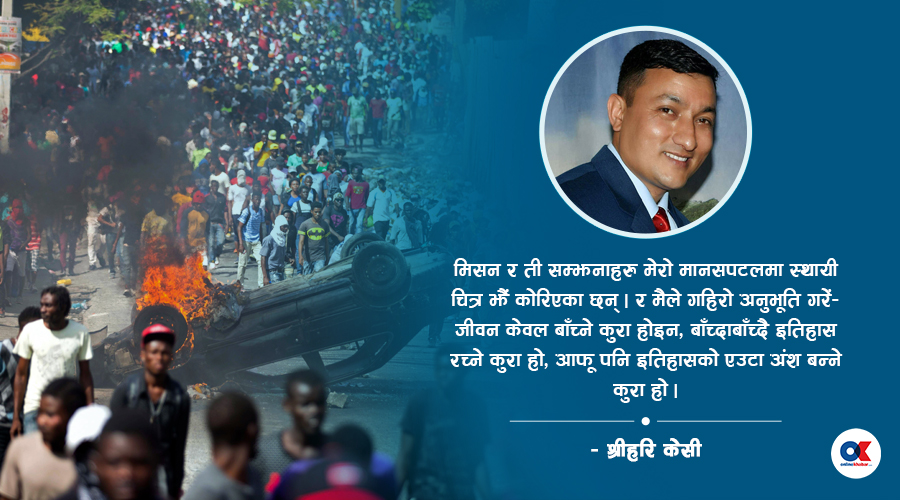 म आफ्नो मिसनका हरेक जिम्मेवारी सफलतापूर्वक सम्पन्न गरेर फर्किएँ। तर हाइटीमा बिताएको त्यो एक यात्रा, त्यो मिसन र ती सम्झनाहरू मेरो मानसपटलमा स्थायी चित्र झैं कोरिएका छन्। र मैले गहिरो अनुभूति गरें- जीवन केवल बाँच्ने कुरा होइन; बाँच्दाबाँच्दै इतिहास रच्ने कुरा हो, आफू पनि इतिहासको एउटा अंश बन्ने कुरा हो।