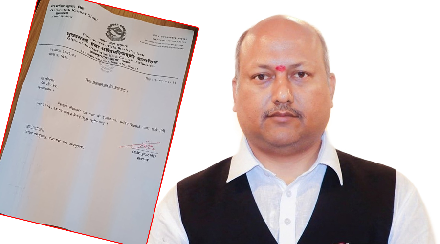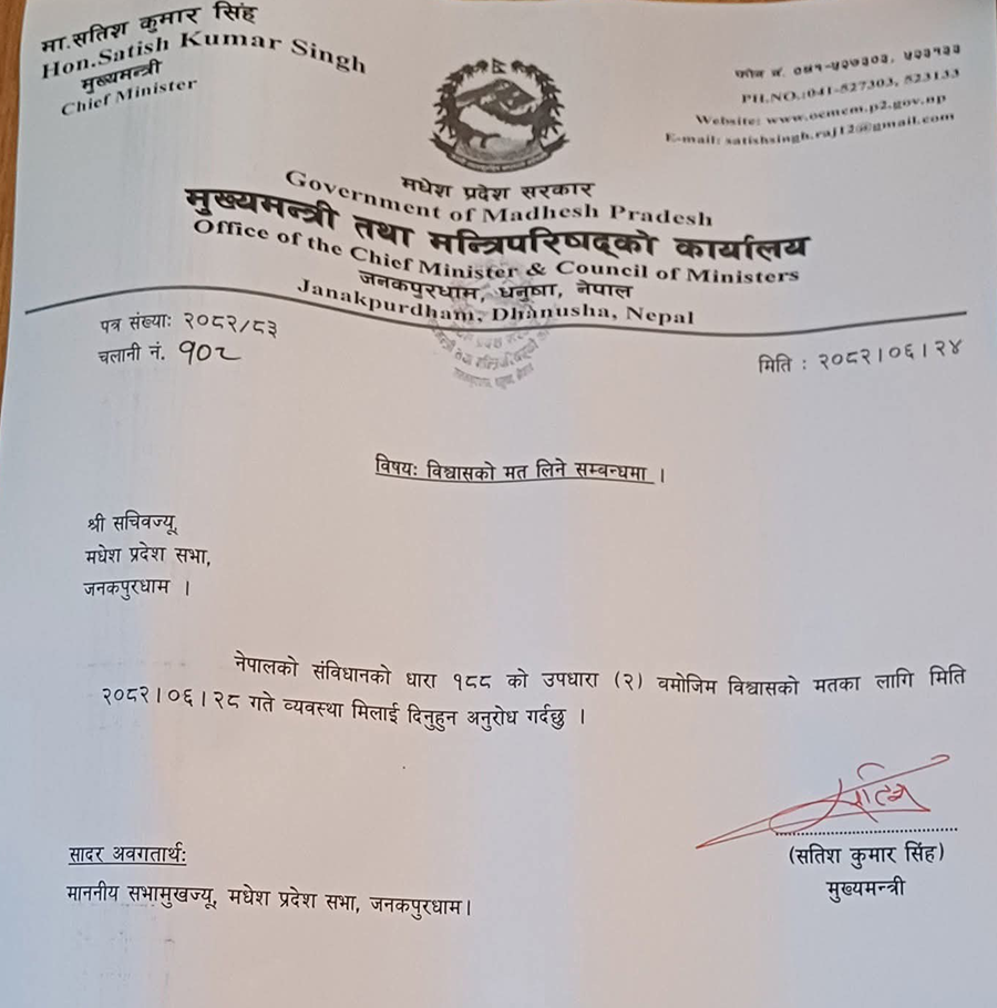 मधेस प्रदेश सभाका सचिवलाई सम्बोधन गर्दै लेखिएको पत्रमा २८ असोजमा संविधानको धारा १८८ को उपधारा २ बमोजिम विश्वासको मत लिनका लागि व्यवस्था मिलाउन हुन अनुरोध गरिएको छ ।