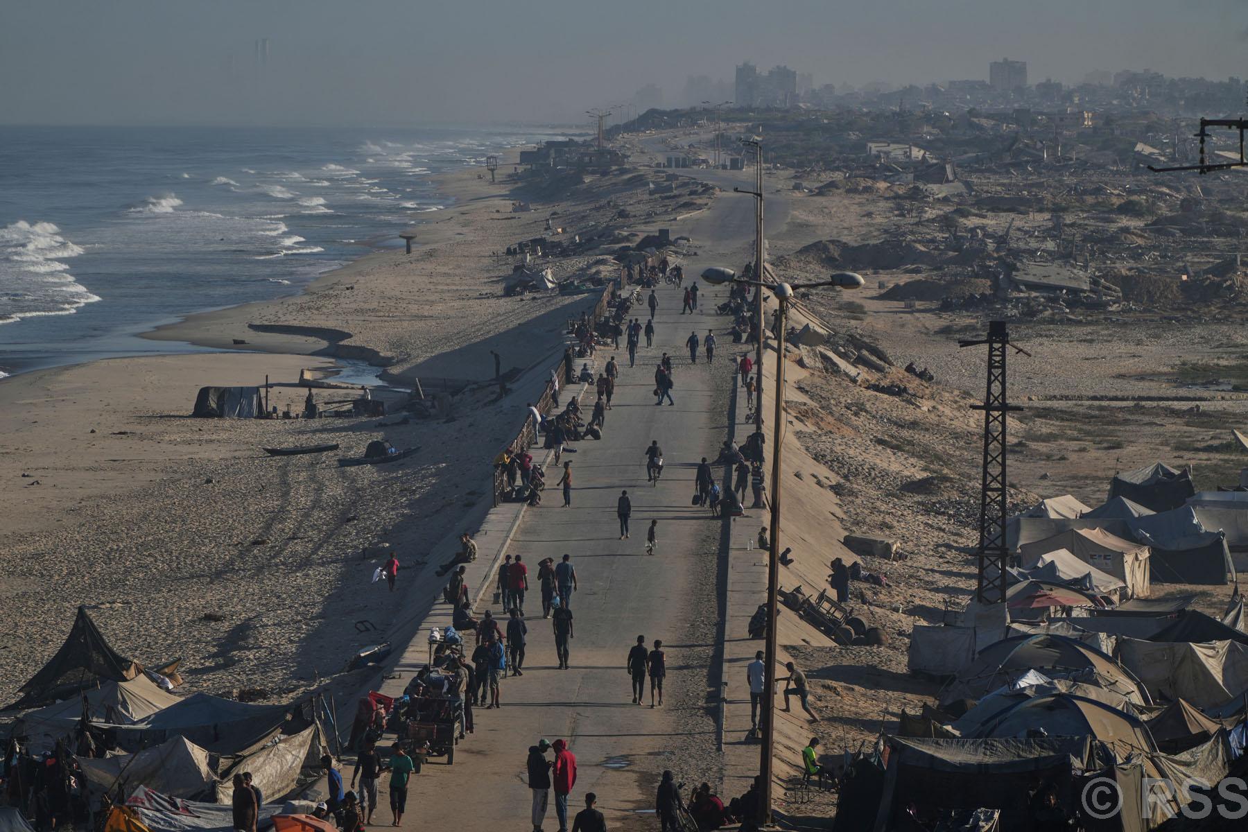 इजरायली आक्रमण क्षतिग्रस्त र साँघुरा तटीय सडकमा कतिपयले विजयभावमा प्यालेस्टिनी झण्डा फहराइरहेका देखिन्थे ।