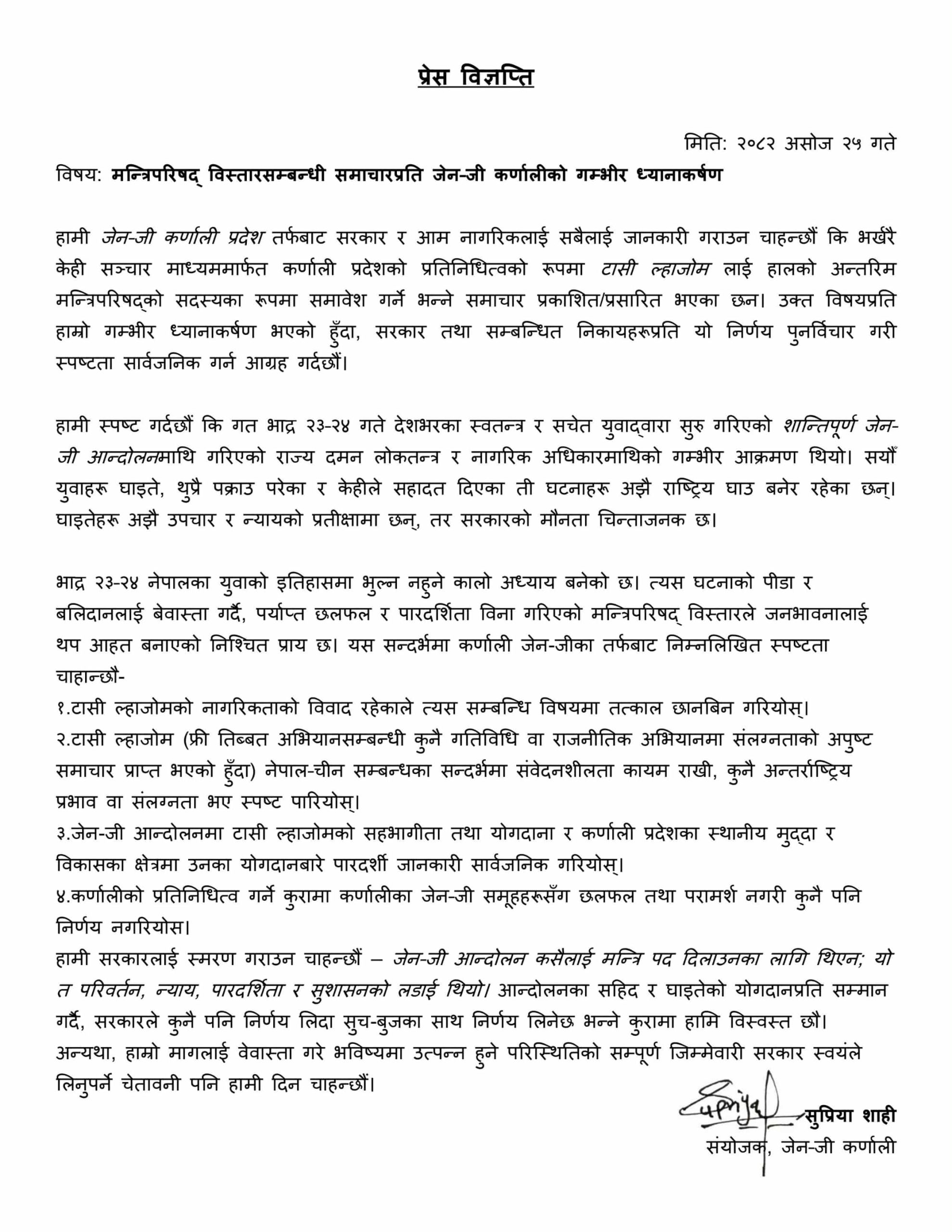 साथै कर्णालीको प्रतिनिधित्व गराउन कर्णालीका जेनजीहरुसँग छलफल र परामर्शविना नगरी कुनै निर्णय नगर्न विज्ञप्तिमा भनिएको छ । टासीलाई कर्णालीको प्रतिनिधित्व गर्ने गरी मन्त्री बनाउन लागिएको हो ।