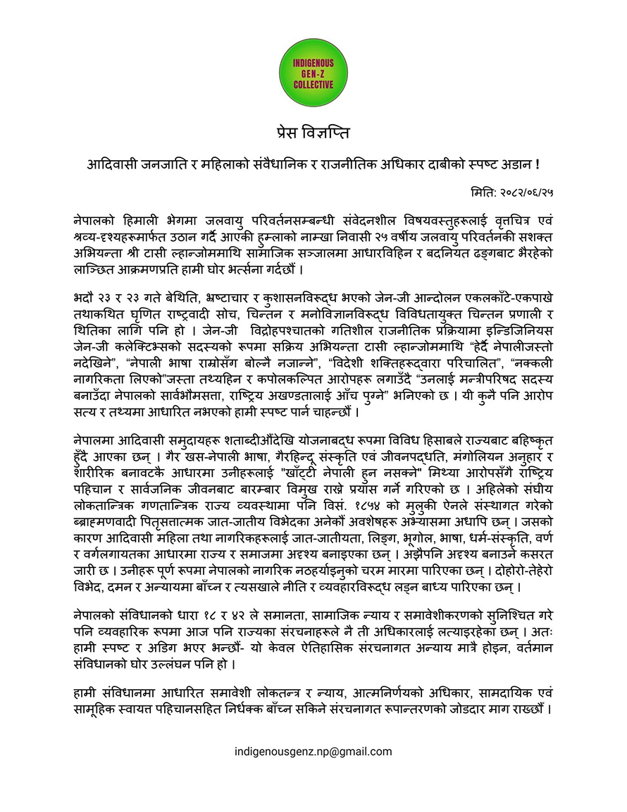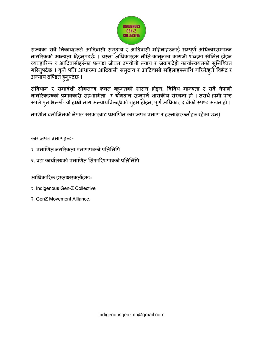 विज्ञप्तिमा आदिवासी जेनजी कलेक्टिभ र जेनजी मुभमेन्ट एलायन्सको हस्ताक्षर छ ।