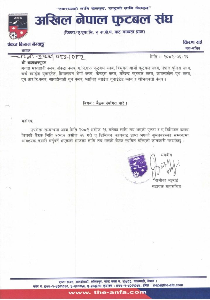 - गत ५ असोजमा एन्फाले ए डिभिजनका १६ क्लबलाई छलफलमा सहभागी हुन पत्राचार गरेको थियो।