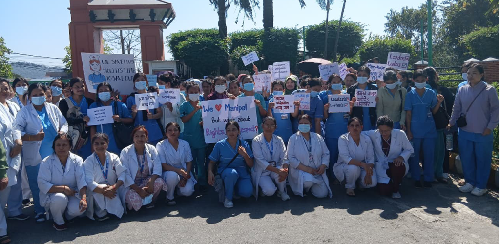 मणिपाल प्रांगणमा श्रम शोषणविरुद्ध सम्मानजनक सुविधा माग गर्दै प्लेकार्डसहित नारा लगाइरहेका अधिकांश नर्सहरू द्वविधामा देखिए, ‘बोल्दा आन्दोलनको नेतृत्व गरेको भन्दै प्रशासनबाट दबाब आउँछ कि ।’