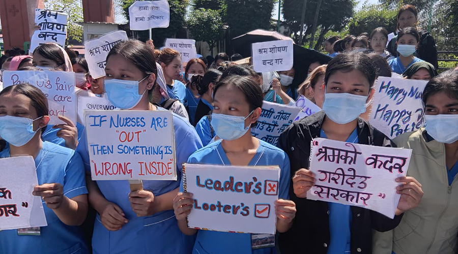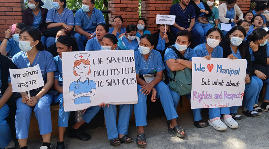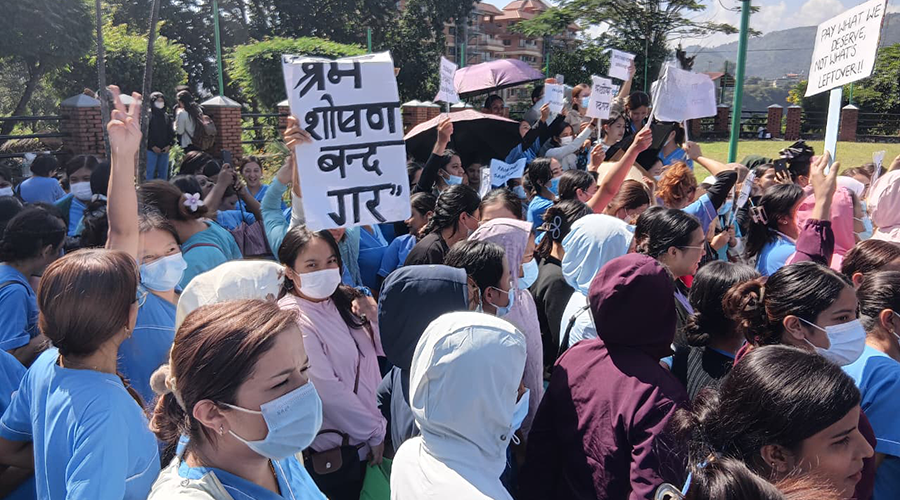 पोखराको मणिपाल शिक्षण अस्पतालका नर्सहरूले पछिल्लो पटक यसरी नै न्याय मागिरहेको २ हप्ता हुन लाग्यो । अस्पताल प्रशासनले मात्रै होइन, राज्यले नै सुनोस् भनेर चर्को आवाजमा नर्सहरू चिच्चाइरहेका छन्, ‘श्रम शोषण बन्द गर ।’