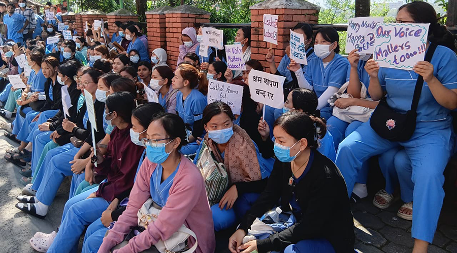 ‘एक्लाएक्लै बोलौं, अस्पताल प्रशासनबाटै अनेक चेतावनी खेप्नुपर्छ । नबोलौं, अपमान सहनुपर्छ,’ नर्सहरूको दुखेसो छ । आफैंले रोजेको पेसामा हिलो छ्यापिएको महसुस नर्सहरूले गरिरहेका छन् । गुजारा चल्नेसम्म पनि पारिश्रमिक र सुविधा नहुँदा अधिकांशले विदेशिने सपना देखिरहेका छन् ।