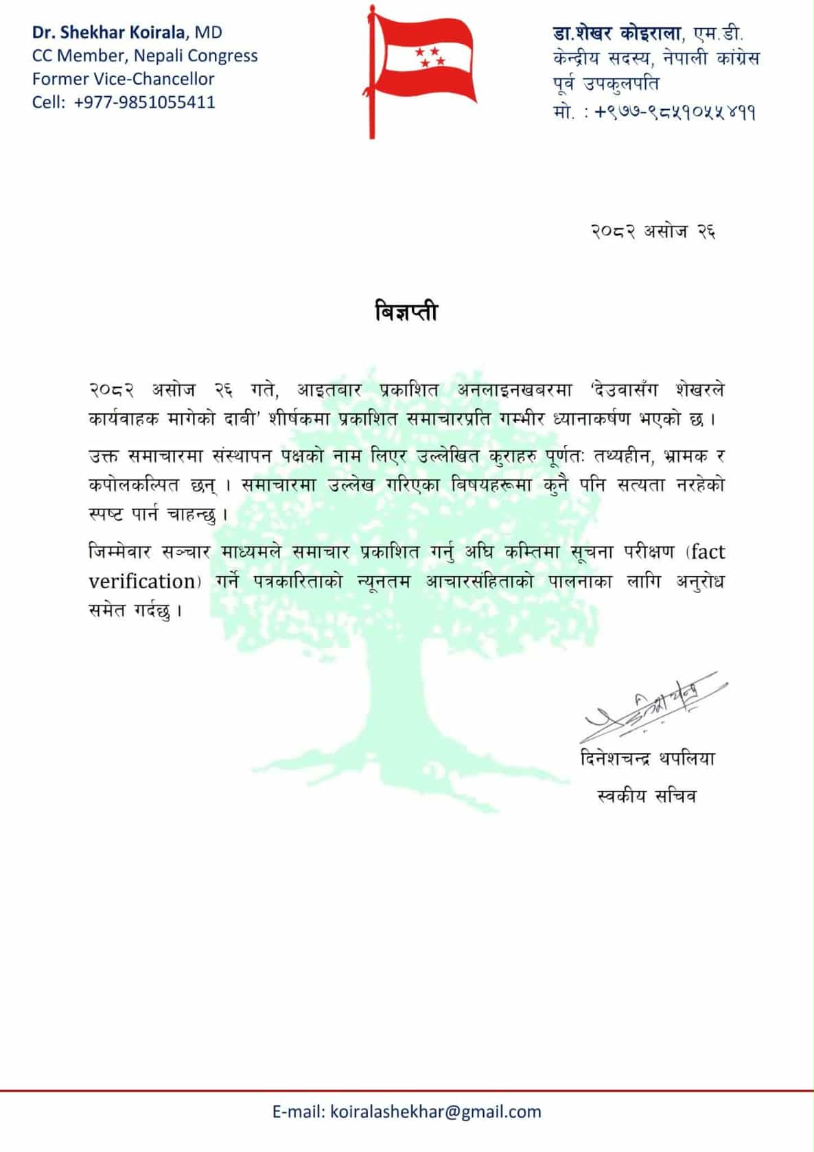 नेता कोइरालाका स्वकीय सचिव दिनेशचन्द्र थपलियाले एक विज्ञप्ति जारी गर्दै कार्यवाहक नमागिएको दाबी गरेका हुन् ।