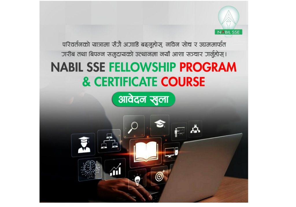 Generated by OK AI. Editorially reviewed.- नबिल बैंकले सामाजिक उद्यमशीलता प्रवर्द्धनका लागि नबिल स्कुल अफ सोसल इन्टरप्रेनरसिप अन्तर्गत नयाँ फेलोसिप र सर्टिफिकेट कोर्सका लागि आवेदन आह्वान गरेको छ।