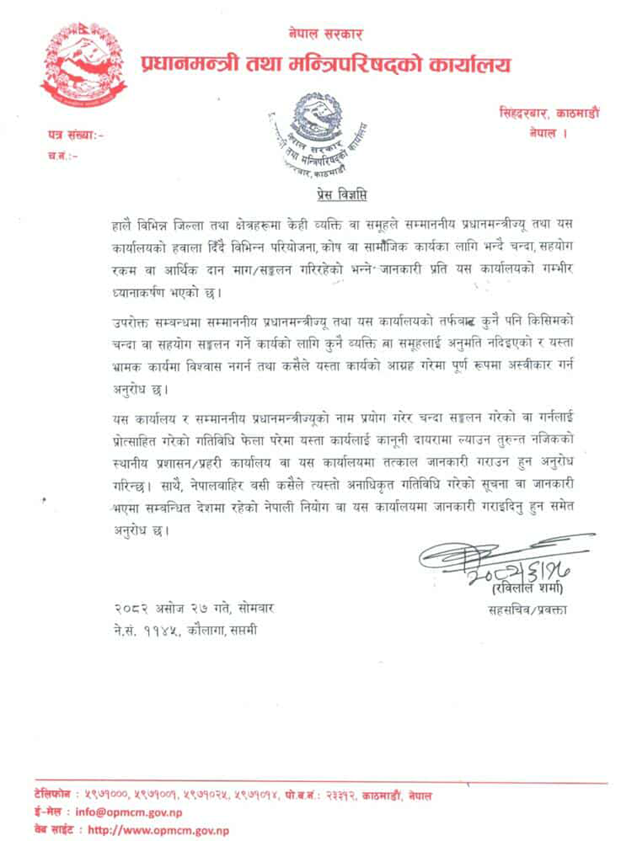 प्रधानमन्त्री कार्की र प्रधानमन्त्री कार्यालयको हवला दिँदै विभिन्न परियोजना, कोष वा सामाजिक कार्यका लागि भन्दै चन्दा सहयोग रकम माग गरिरहेको भन्ने जानकारी प्रति गम्भीर ध्यानाकर्षण भएको विज्ञप्तिमा छ ।