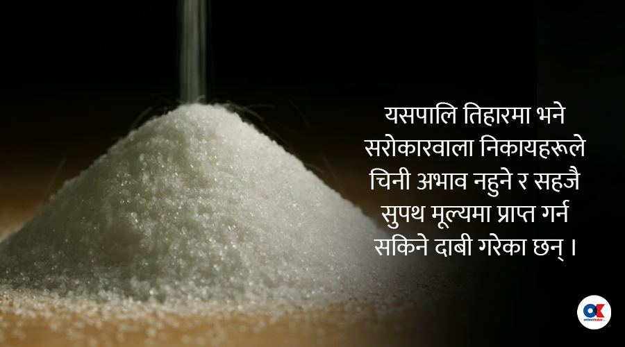 • उद्योग, वाणिज्य तथा आपूर्ति मन्त्रालयले तिहार र छठ पर्वमा चिनी अभाव नहुने र मूल्यमा वृद्धि नहुने दाबी गरेको छ।
