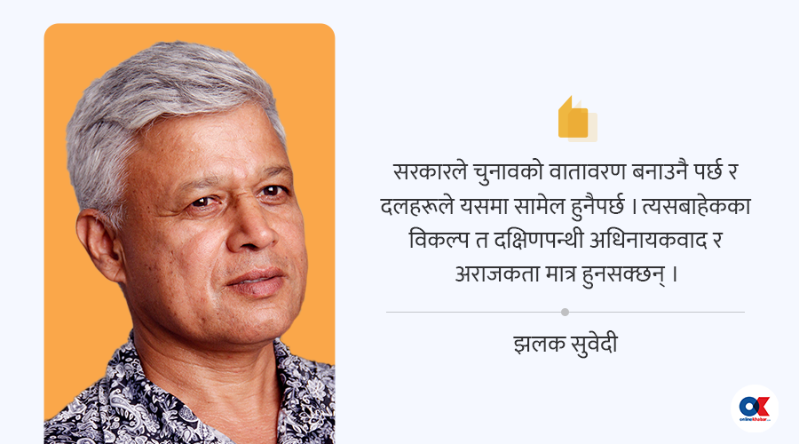 सरकारले चुनावको वातावरण बनाउनै पर्छ र दलहरूले यसमा सामेल हुनैपर्छ । त्यसबाहेकका विकल्प त दक्षिणपन्थी अधिनायकवाद र अराजकता मात्र हुनसक्छन् । हामी भावी पुस्तालाई सग्लो र समृद्ध नेपाल सुम्पन चाहन्छौं भने जेनजीदेखि वाई, एक्ससम्मले आफूलाई चुनावका लागि तयार गर्नैपर्छ ।