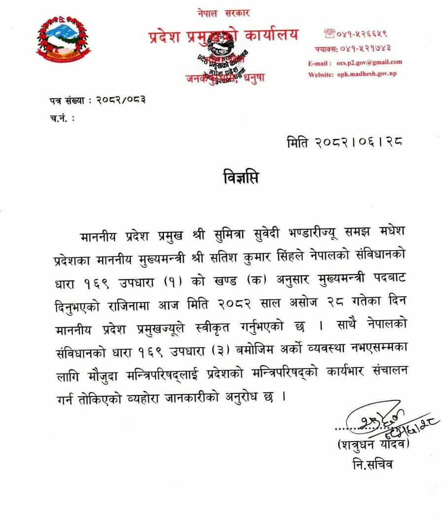 Generated by OK AI. Editorially reviewed.- मधेश प्रदेशका मुख्यमन्त्री सतिश कुमार सिंहले दिएको राजीनामा प्रदेश प्रमुख सुमित्रा सुवेदी भण्डारीले स्वीकृत गर्नुभएको छ।
