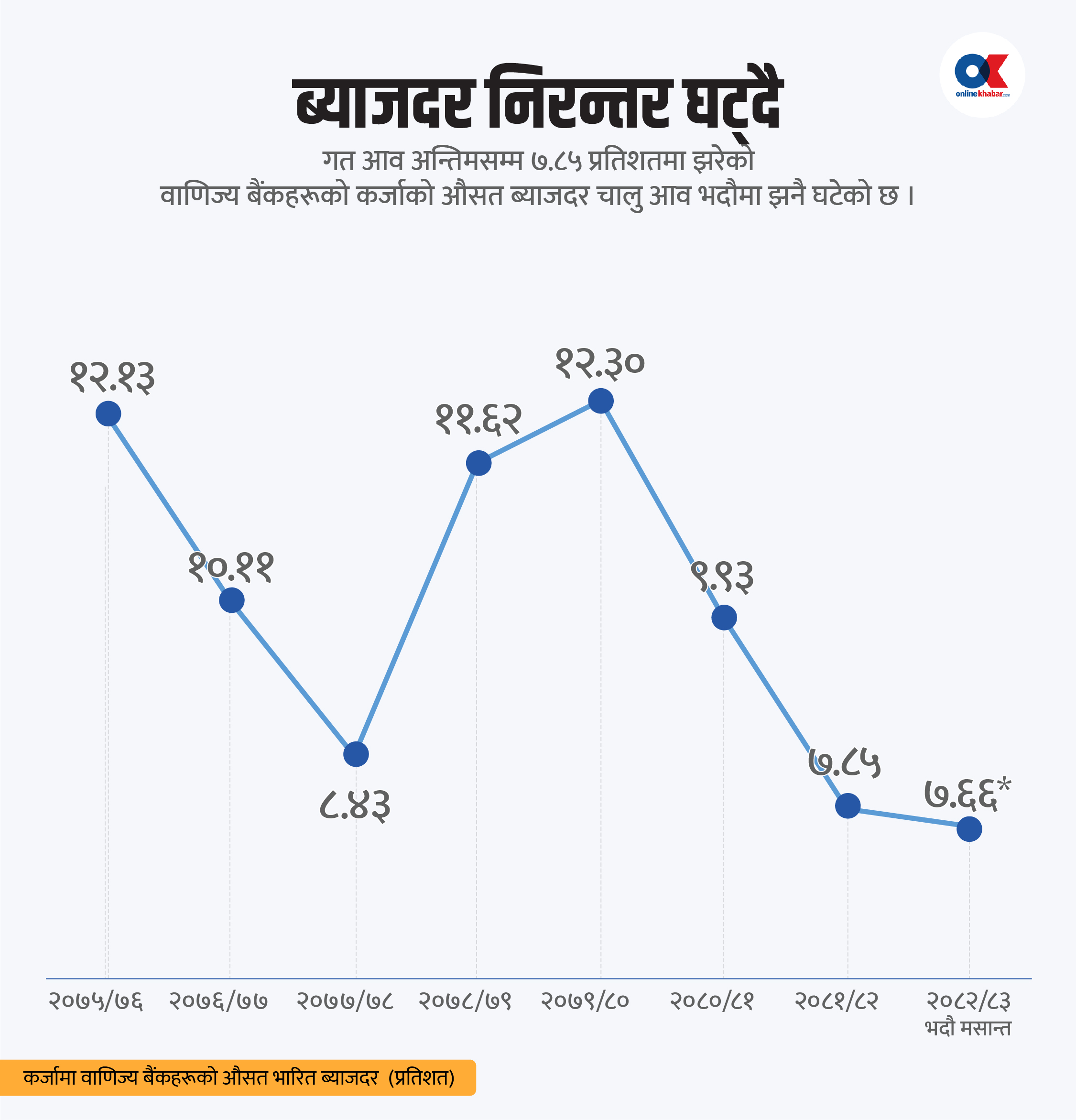 बैंक तथा वित्तीय संस्थामा कर्जा ब्याजदर निरन्तरता घटे पनि कर्जा माग नबढ्दा भने आर्थिक गतिविधिमा अपेक्षा गरे अनुसार सुधार हुन सकेको छैन ।