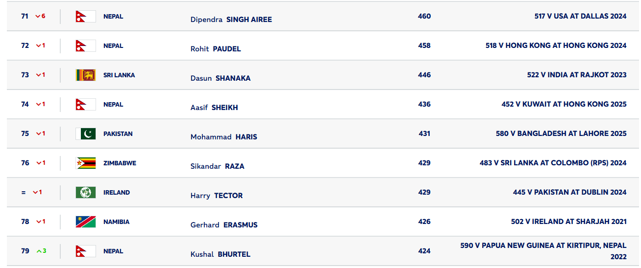 ओपनर कुशल भुर्तेल भने ३ स्थान सुधार गरेर ७९औं स्थानमा पुगेका छन् । कप्तान रोहित पौडेल र ओपनिङ ब्याटर आसिफ शेख १-१ स्थान खस्किएर क्रमश: ७२औं र ७४औं स्थानमा पुगेका छन् ।
