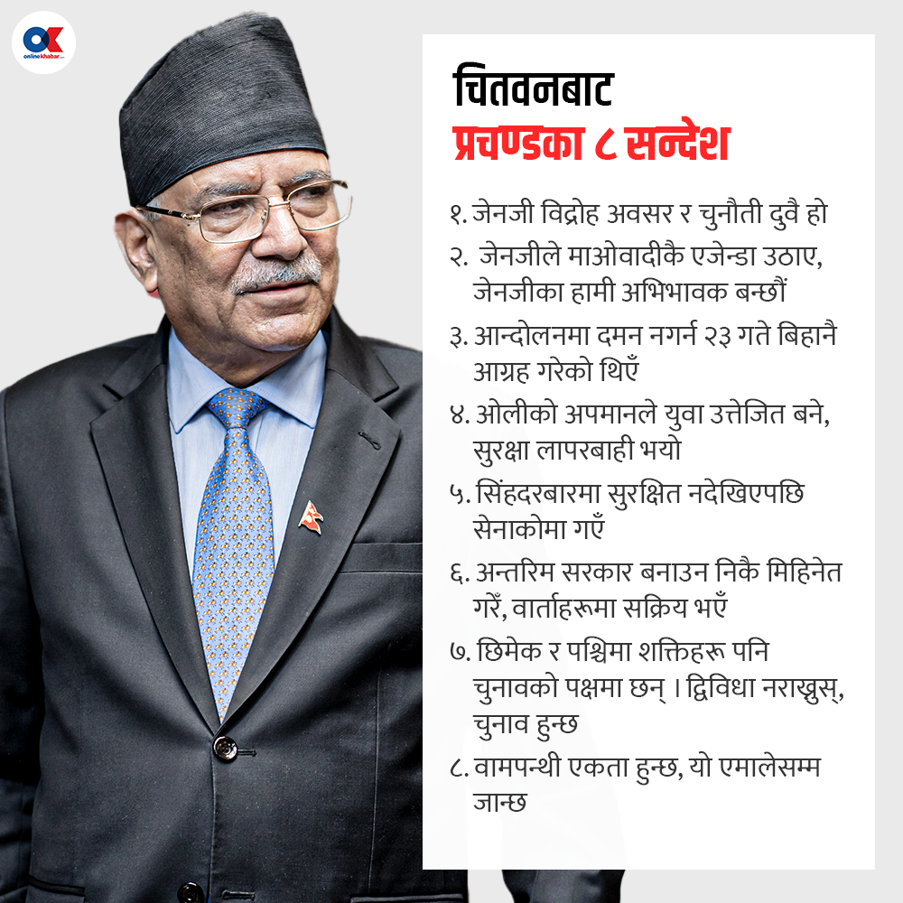 Generated by OK AI. Editorially reviewed.- नेकपा माओवादी केन्द्रका अध्यक्ष प्रचण्डले जेन्जी युवाहरूको आन्दोलनका मागहरू जायज रहेको र सरकारले बल प्रयोग नगर्न आग्रह गरेको बताए।