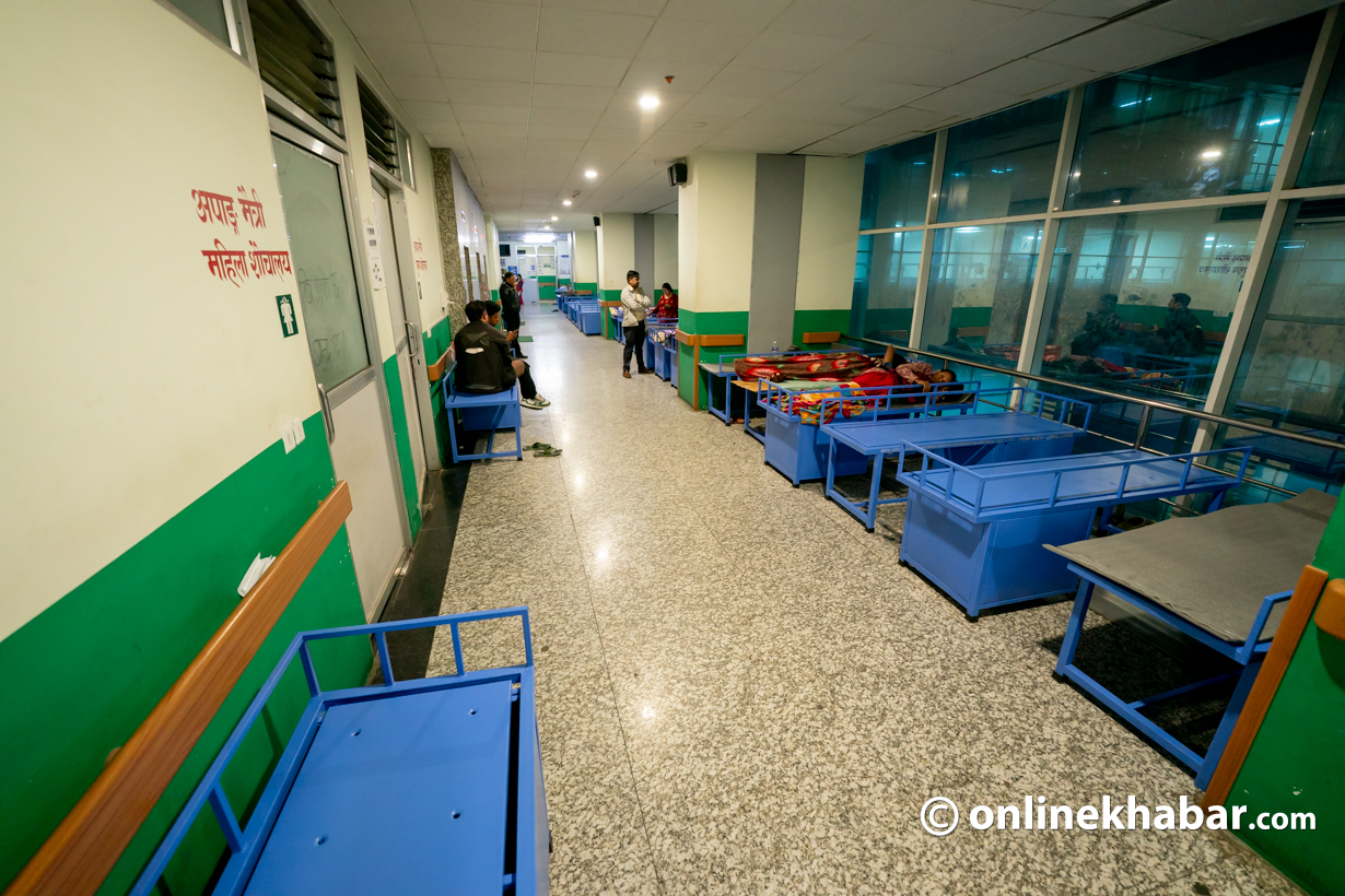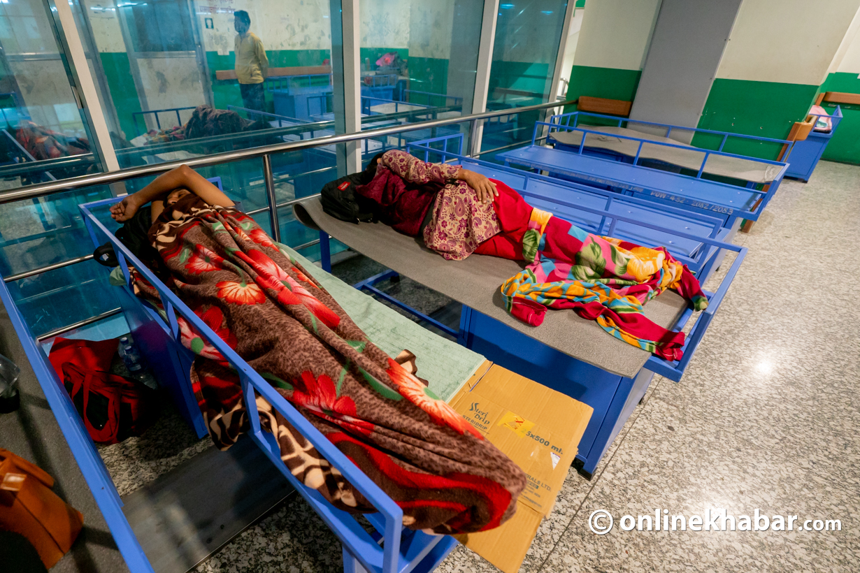 २९ असोज, काठमाडौं । मंगलबार राति ९ बजे । वीर अस्पताल सर्जरी भवनको चौथो तला । एचडीयू, पोस्टअप र एआईसीयू बाहिर लस्करै बिरामी कुरुवाका बेडहरू छन् ।
