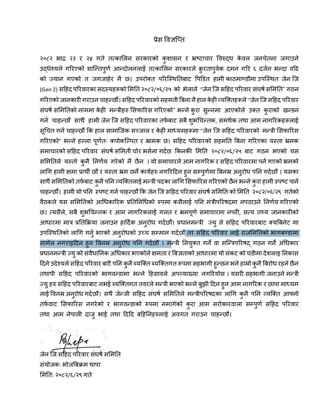 ३१ असोज, काठमाडौं । जेनजी शहीद परिवार संघर्ष समितिले आफूहरूले मन्त्रीका लागि कुनै पनि व्यक्तिलाई सिफारिस नगरेको बताएको छ ।