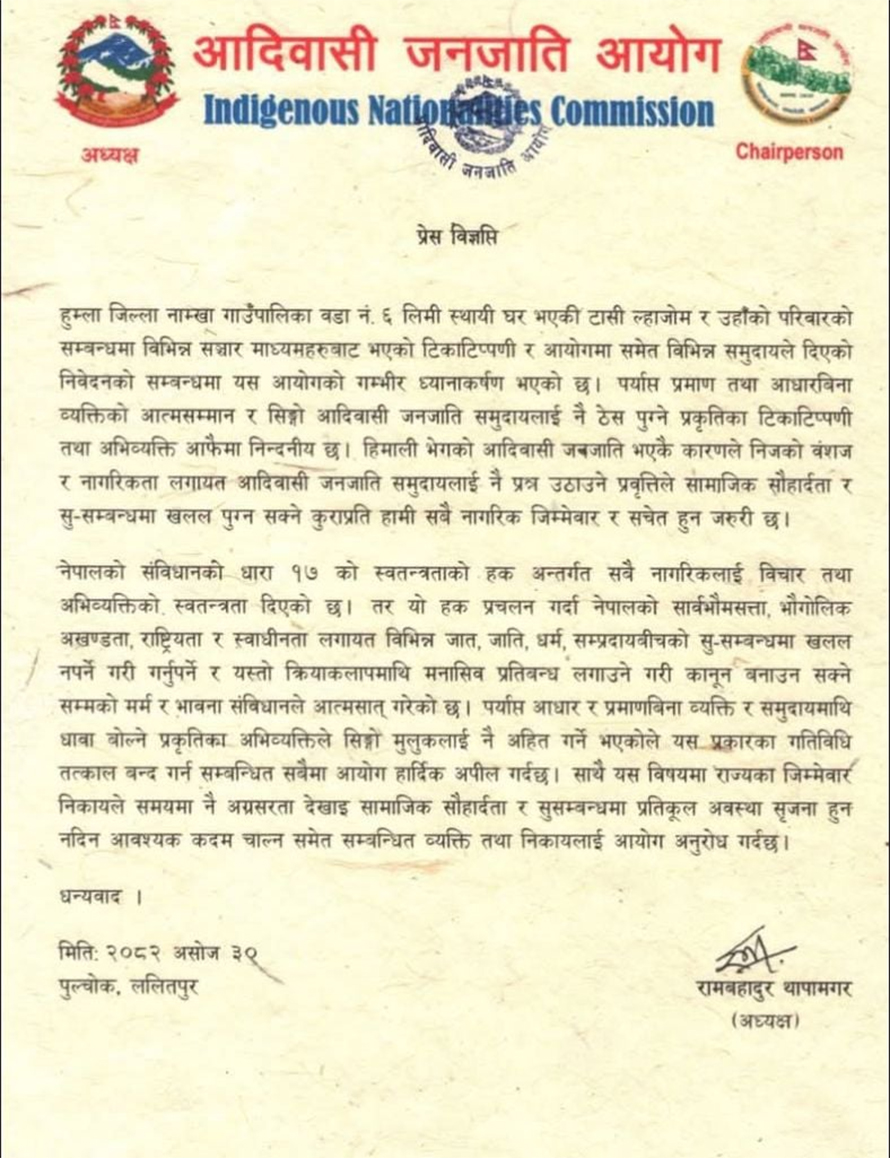 Generated by OK AI. Editorially reviewed.- आदिवासी जनजाति आयोगले हुम्ला जिल्लाको नाम्खा गाउँपालिका–६, लिमीकी टासी ल्हाजोम र उनको परिवारबारे भएका आधारहीन टिप्पणीप्रति गम्भीर आपत्ति जनाएको छ।