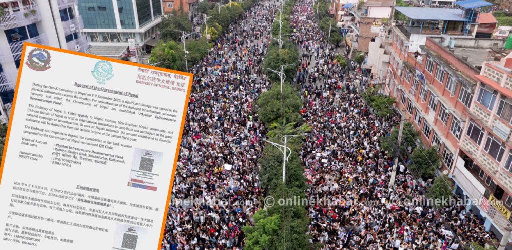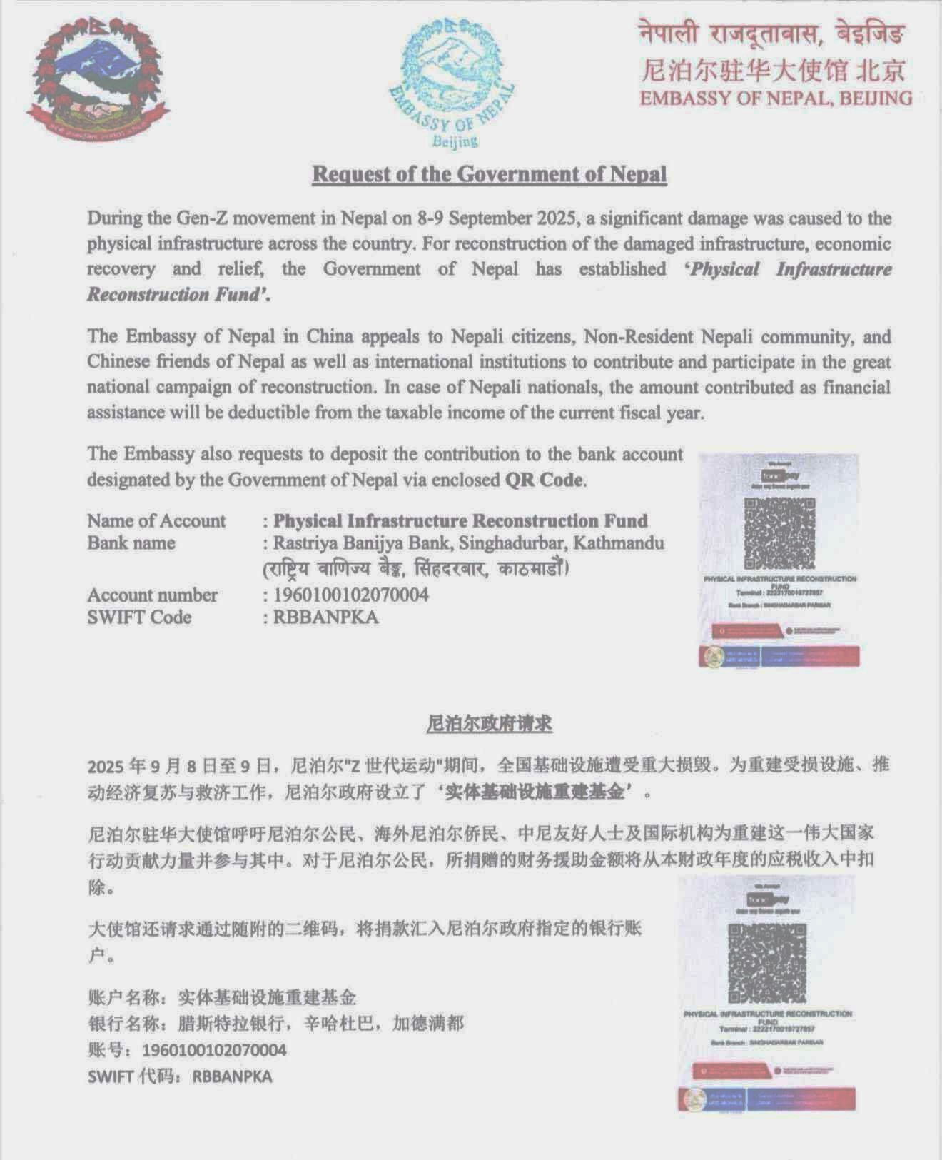 ‘८ र ९ सेप्टेम्बर २०२५ (२३ र २४ भदौ २०८२) मा जेनजी आन्दोलनको क्रममा देशभरका भौतिक पूर्वाधारमा असाधारण क्षति पुगेको छ। नेपाल सरकारले उद्दार, ध्वस्त भौतिक संरचनाहरूको पुनर्निर्माण, तहसनहस भएको आर्थिक क्षेत्रको पुनर्स्थापनालगायतमा सहायताका लागि ‘भौतिक पूर्वाधार पुनर्निर्माण कोष’ स्थापना गरेको छ,’ दूतावासले भनेको छ, ‘बेइजिङस्थित नेपाली दूतावास आफ्ना नागरिकहरू, गैरआवासीय नेपाली समुदाय र चिनियाँ समुदाय, अन्तर्राष्ट्रिय समुदायलाई नेपालको पुनर्निर्माणमा सघाउन हार्दिक अपील गर्दछ।’