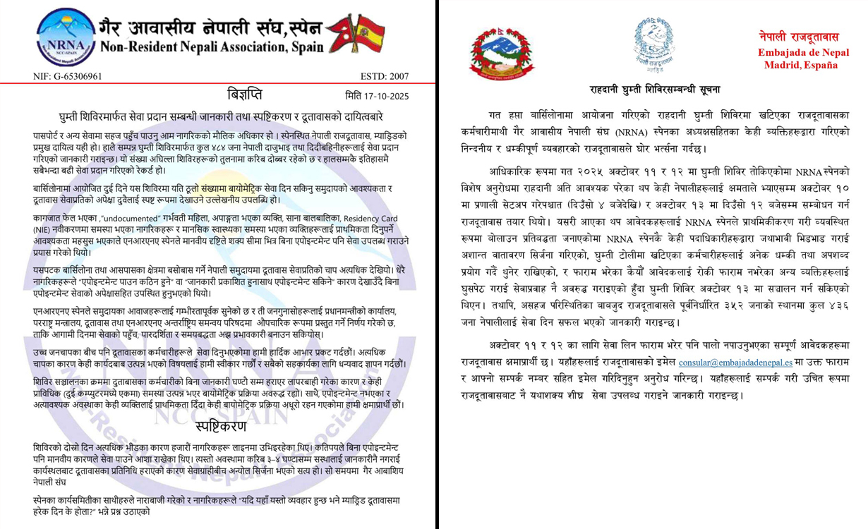 एनआरएनए स्पेनले भने दूतावासको आरोपलाई ‘पूर्णतः गलत र एकतर्फी व्याख्या’ गरेको भन्दै विस्तृत स्पष्टीकरणसहित विज्ञप्ति सार्वजनिक गरेको छ।