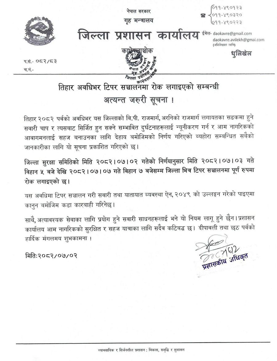 आइतबार एक सूचना जारी गर्दै प्रशासनले ३ कात्तिक बिहान ५ बजेदेखि ७ कात्तिक बिहान ७ बजेसम्म जिल्लाभित्र पूर्ण रूफमा टिपर सञ्चालनमा रोक लगाएको जनाएको छ ।