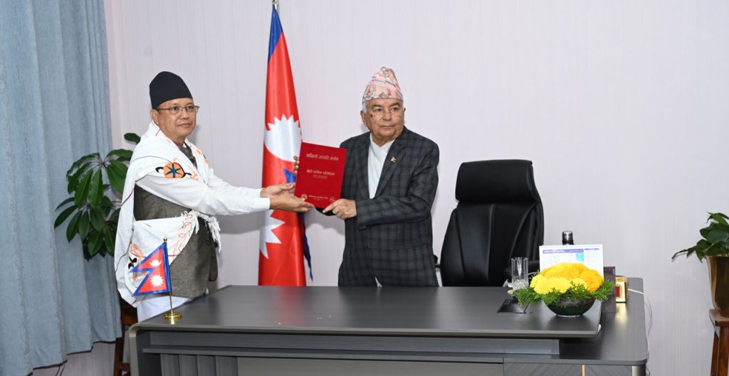 Generated by OK AI. Editorially reviewed.- राष्ट्रपति रामचन्द्र पौडेलसमक्ष आदिवासी जनजाति आयोगको आर्थिक वर्ष ०८१/८२ को वार्षिक प्रतिवेदन पेस गरिएको छ।