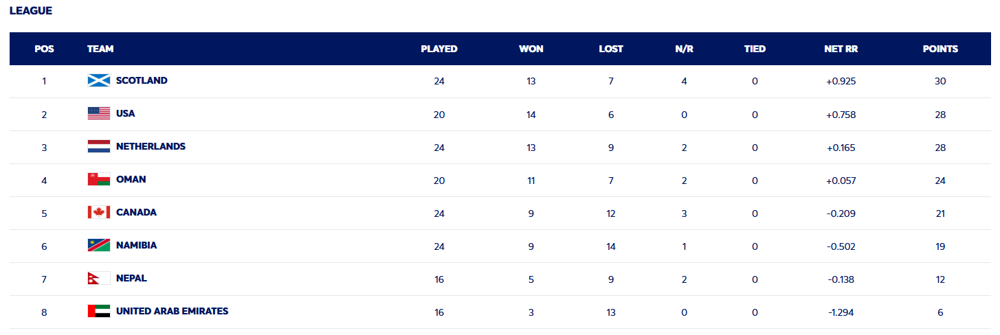 लिग टु मा कूल ८ टोलीले प्रतिस्पर्धा गरिरहेका छन् । जहाँ स्कटल्याण्ड २४ खेलबाट ३० अंकसहित शीर्ष स्थानमा छ । २० खेल खेलेको अमेरिका २८ अंकसहित दोस्रोमा छ । २४ खेल खेलिसकेको नेदरल्याण्ड्स २८ अंक नै भएपनि नेटरनरेटका आधारमा तेस्रोमा छ । ओमान २० खेलबाट २४ अंक जोडेर चौथो, क्यानडा २४ खेलबाट २१ अंकसहित पाँचौ र नामिबिया २४ खेलबाट १९ अंकसहित छैटौं स्थानमा छ ।