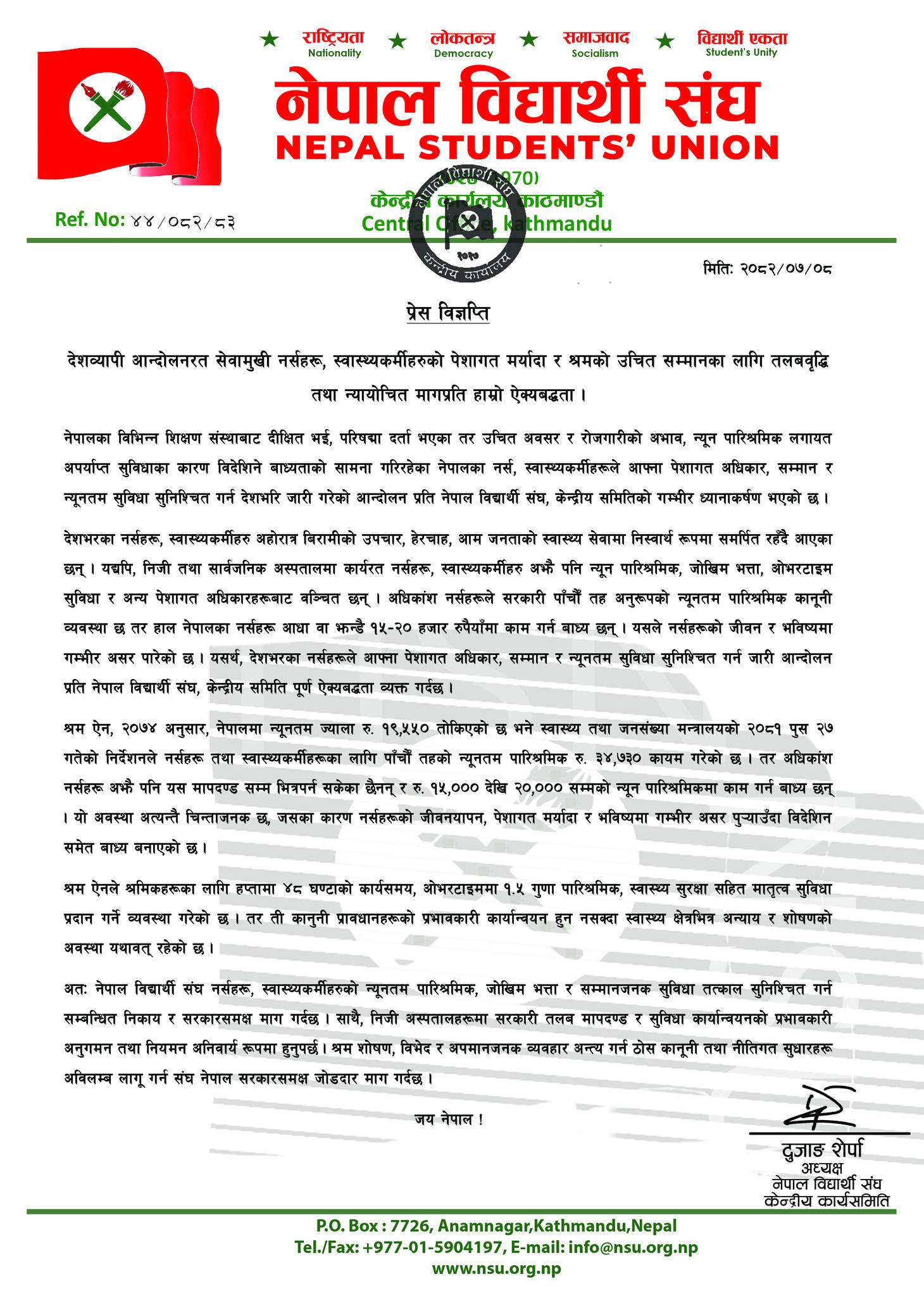 ‘देशभरका नर्सहरूले आफ्ना पेशागत अधिकार, सम्मान र न्यूनतम सुविधा सुनिश्चित गर्न जारी आन्दोलनप्रति नेपाल विद्यार्थी संघ, केन्द्रीय समिति पूर्ण ऐक्यबद्धता व्यक्त गर्दछ,’ विज्ञप्तिमा भनिएको छ ।
