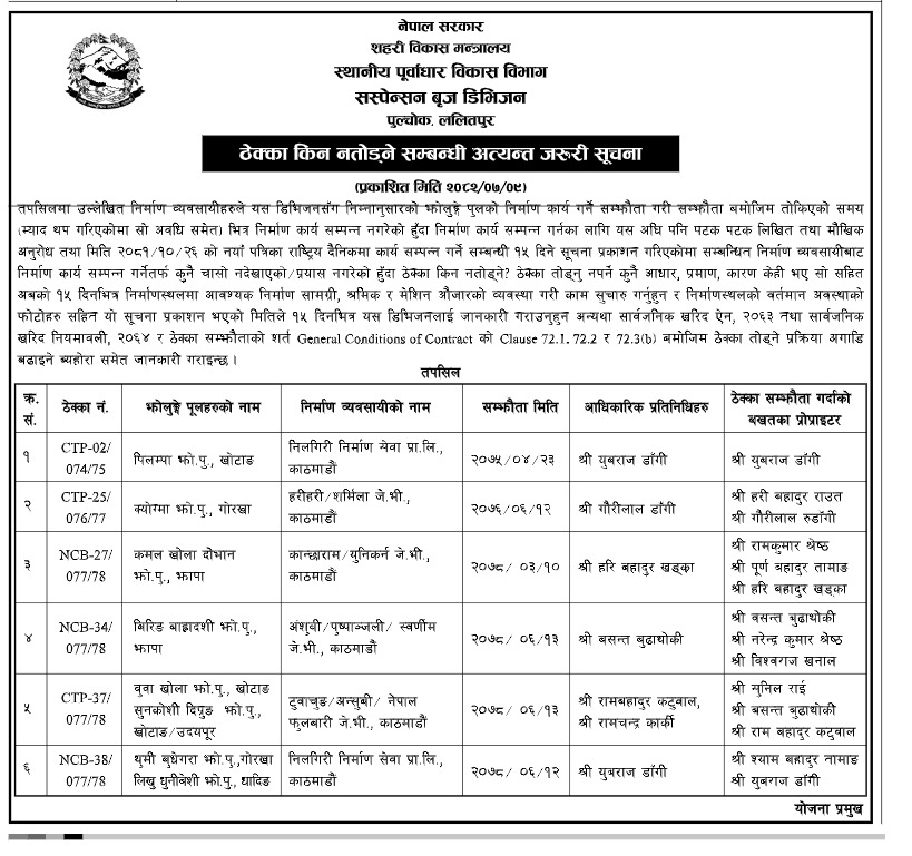 विभागले आइतबार सूचना निकालेर १५ दिन भित्र निर्माणस्थलमा उपस्थित भई काम थाल्न भनेको छ । त्यसो नभए ठेक्का तोड्ने चेतावनी दिइएको छ।