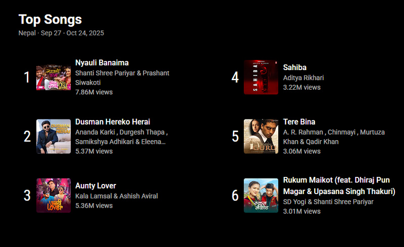 • यो तथ्यांक पछिल्लो २८ दिनको हो र गीतले दुर्गेश थापाको ‘दुश्मन हेरेको हेर्‍यै’ र कला लम्साल-आशिष अविरलको ‘अन्टी लभर’लाई पछि पारेको छ।
