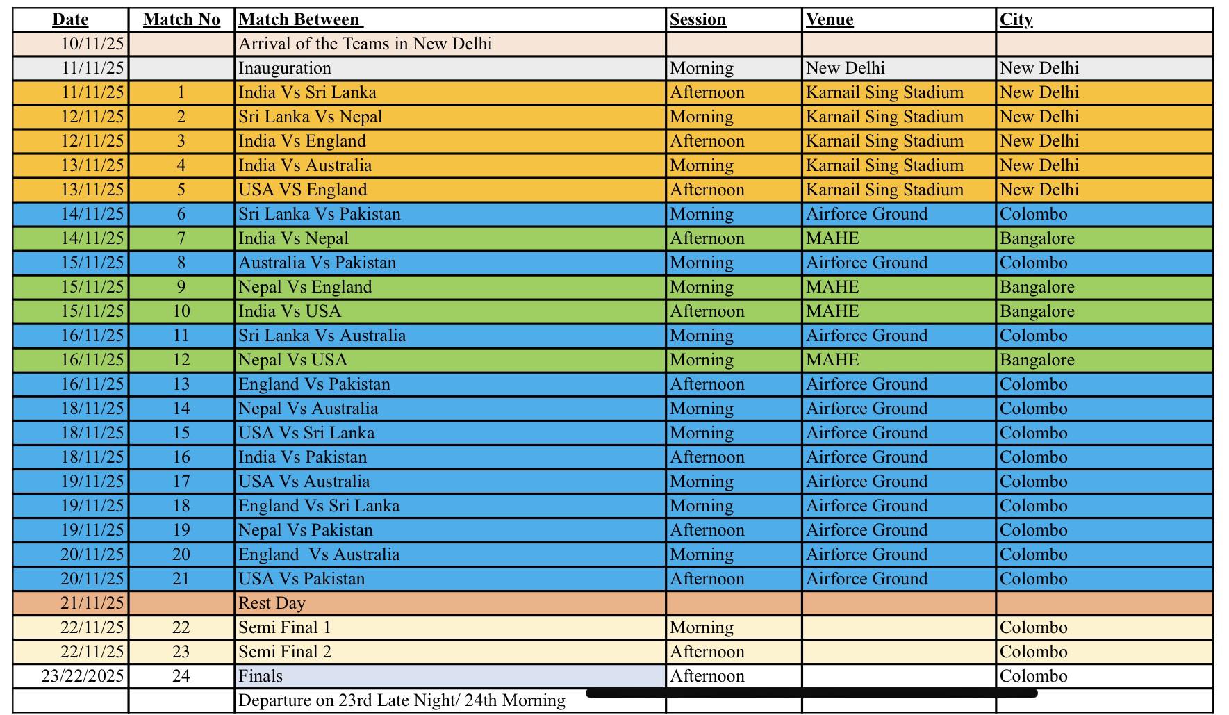 नेपालले दोस्रो खेल भारतसँग बेंगलुरुमा नोभेम्बर १४ मा खेल्नेछ । यस्तै तेस्रो खेल इंग्ल्याण्डसँग नोभेम्बर १५ र चौथो खेल अमेरिकासँग नोभेम्बर १६ मा बेगालुरुमै खेल्नेछ ।