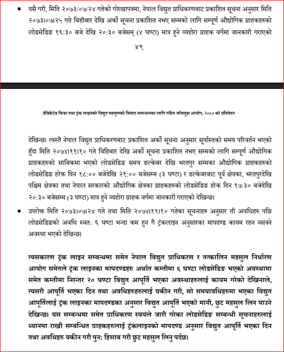 १ साउन २०७३ देखि लागु हुने गरी न्यूनतम ६ घण्टा लोडसेडिङ भएका बखत २० घण्टा वा बढी बिजुली लिन चाहने उद्योगीलाई डेडिकेटेड लाइन सरह महसुल लिई निरन्तर बत्ती दिन सक्ने गरी तत्कालीन विद्युत् महसुल निर्धारण आयोगले निर्णय गरेको थियो ।