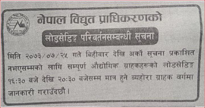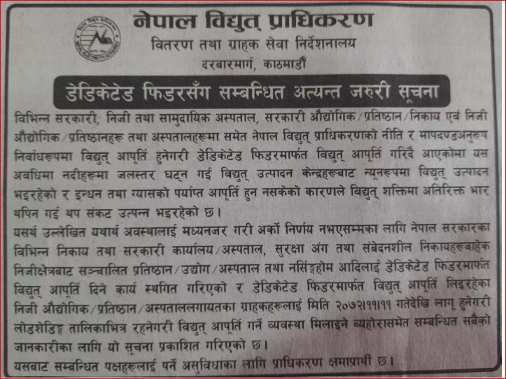 त्यसबीच के भएको थियो त ? तत्कालीन विद्युत् महसुल निर्धारण आयोगले लोडसेडिङका बेला पनि चौबिसै घण्टा निरन्तर विद्युत् पाइने लाइनलाई डेडिकेडेट भन्दै त्यस्तो बिजुली प्रयोग गरेबापत सामान्य दरभन्दा ६० प्रतिशत बढी महसुल निर्धारण गरेको थियो २९ पुस २०७२ मा ।