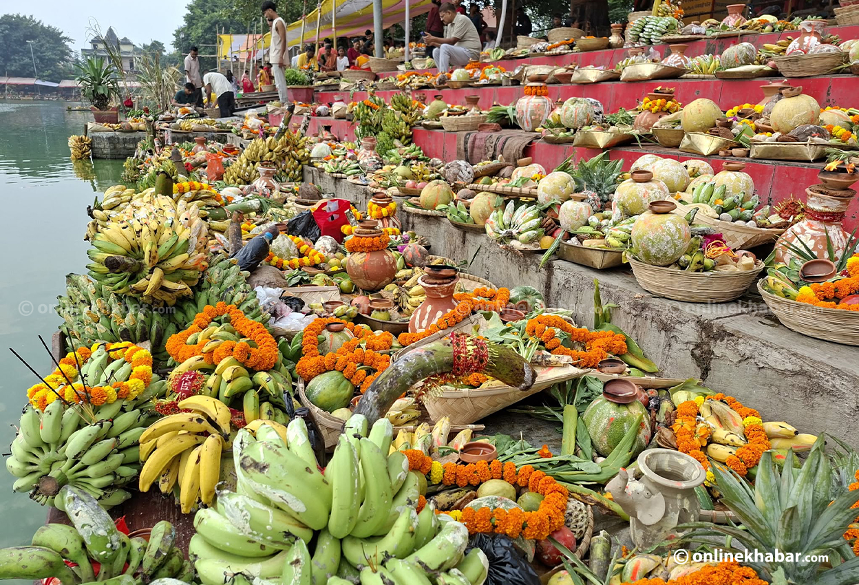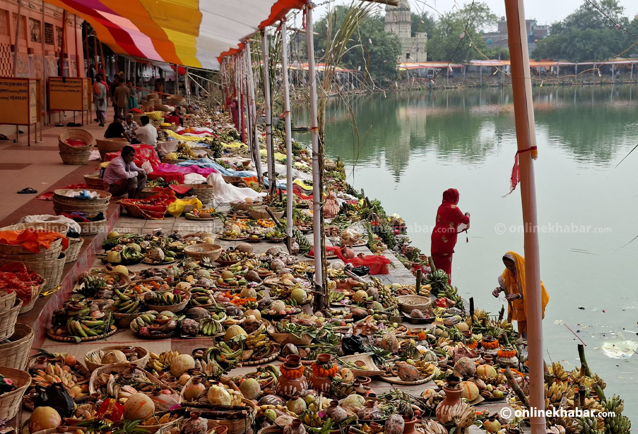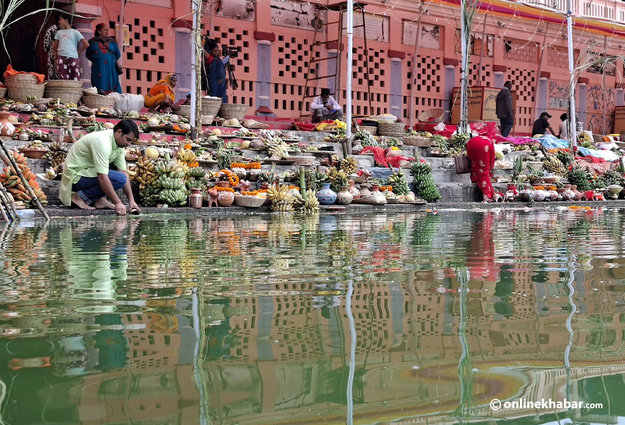 वर्तालुहरूले जनकपुरधामको धार्मिक तथा ऐतिहासिक पोखरी तथा नदी किनाराका छटघाटहरूमा पूजा सामग्रीहरू सजाएर राखेका छन् । अस्ताउँदो सूर्यलाई अर्घ्य दिनका लागि वर्तालुहरू छठघाटमा भेला हुन थालिसकेका छन् ।