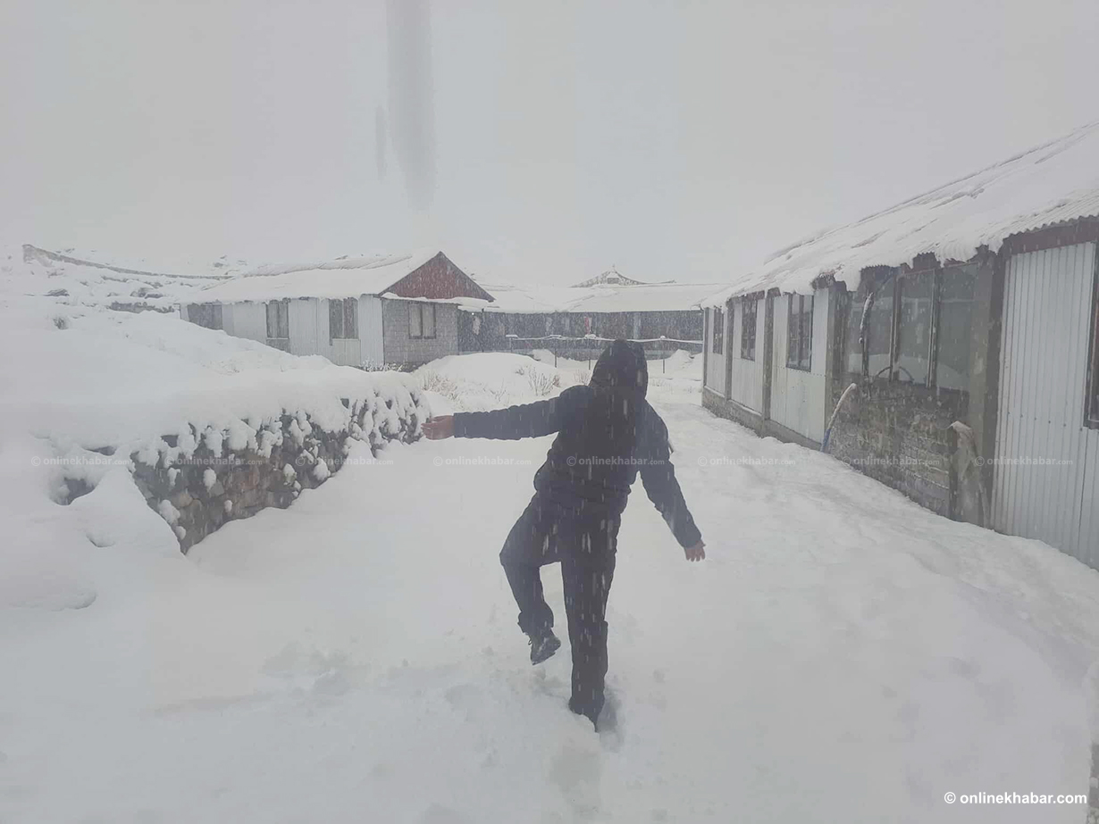 अन्नपूर्ण गाउँपालिका ११, अन्नपूर्ण बेसक्याम्पमा हिमपात भएको हो । ४ हजार १३० मिटर उचाइमा रहेको बेसक्याम्पमा आन्तरिक तथा बाह्य पर्यटकहरु छन् । उनीहरु हिउँमा रमाइरहेका छन् ।