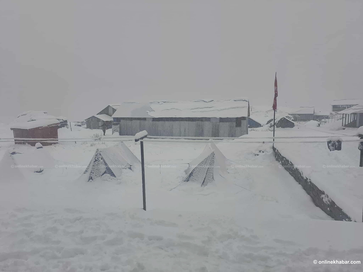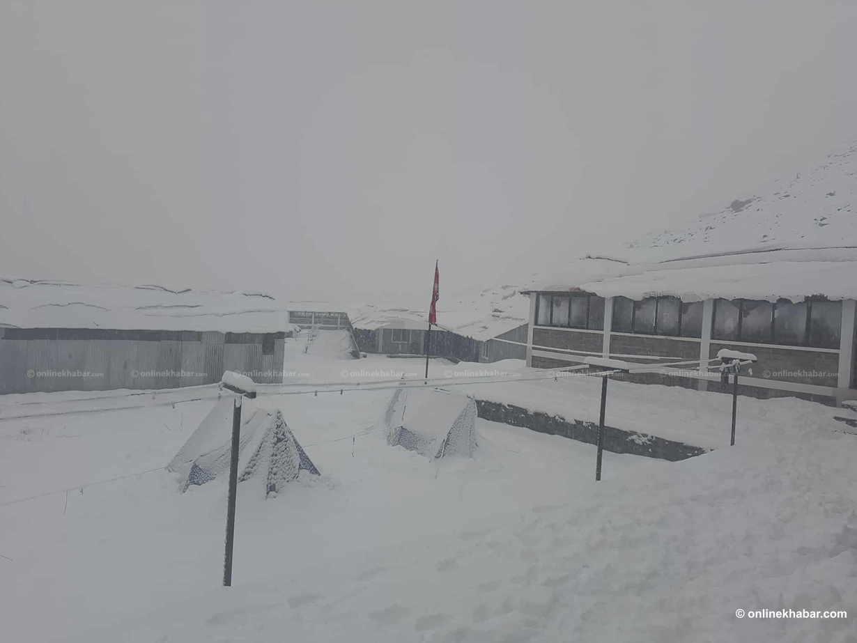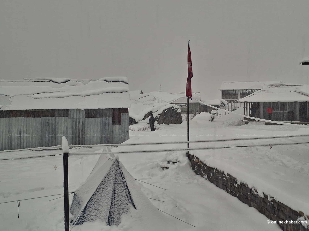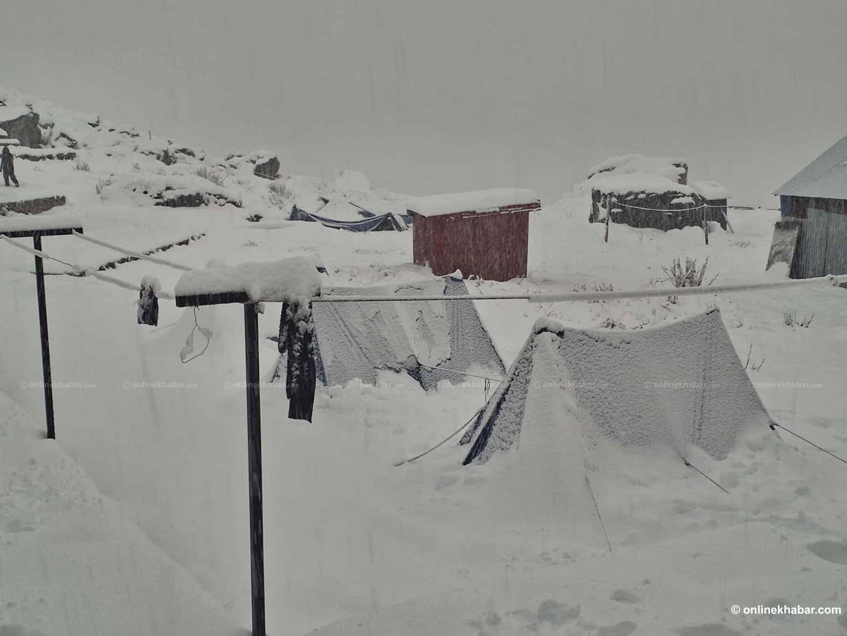 ११ कात्तिक, काठमाडौं । अन्नपूर्ण बेसक्याम्प क्षेत्रमा गएरातिदेखि बाक्लो हिमपात भइरहेको छ ।