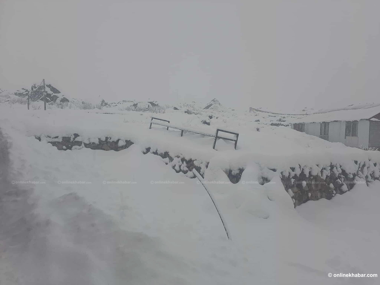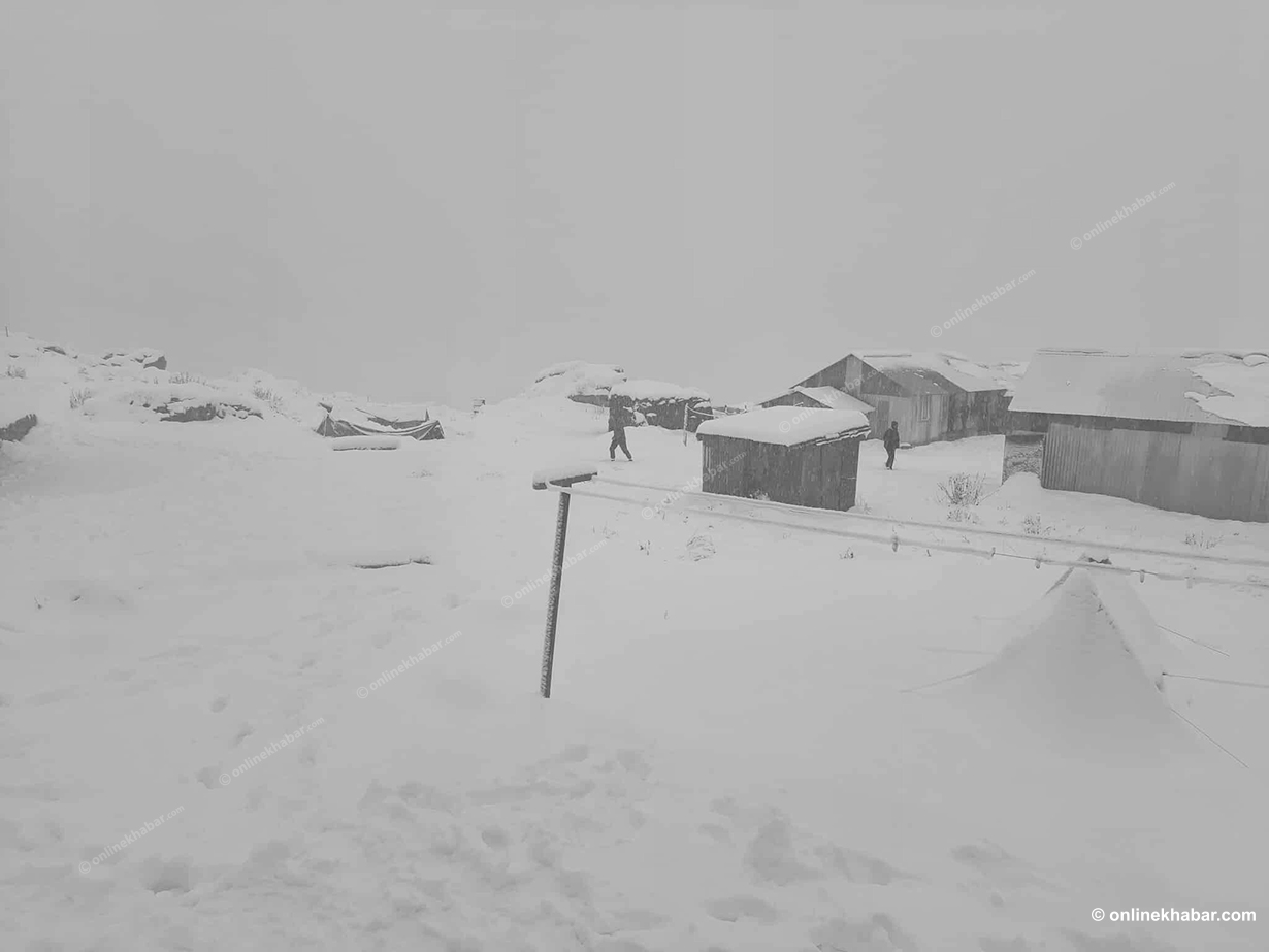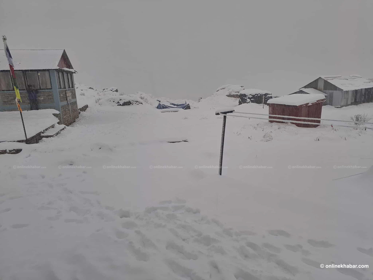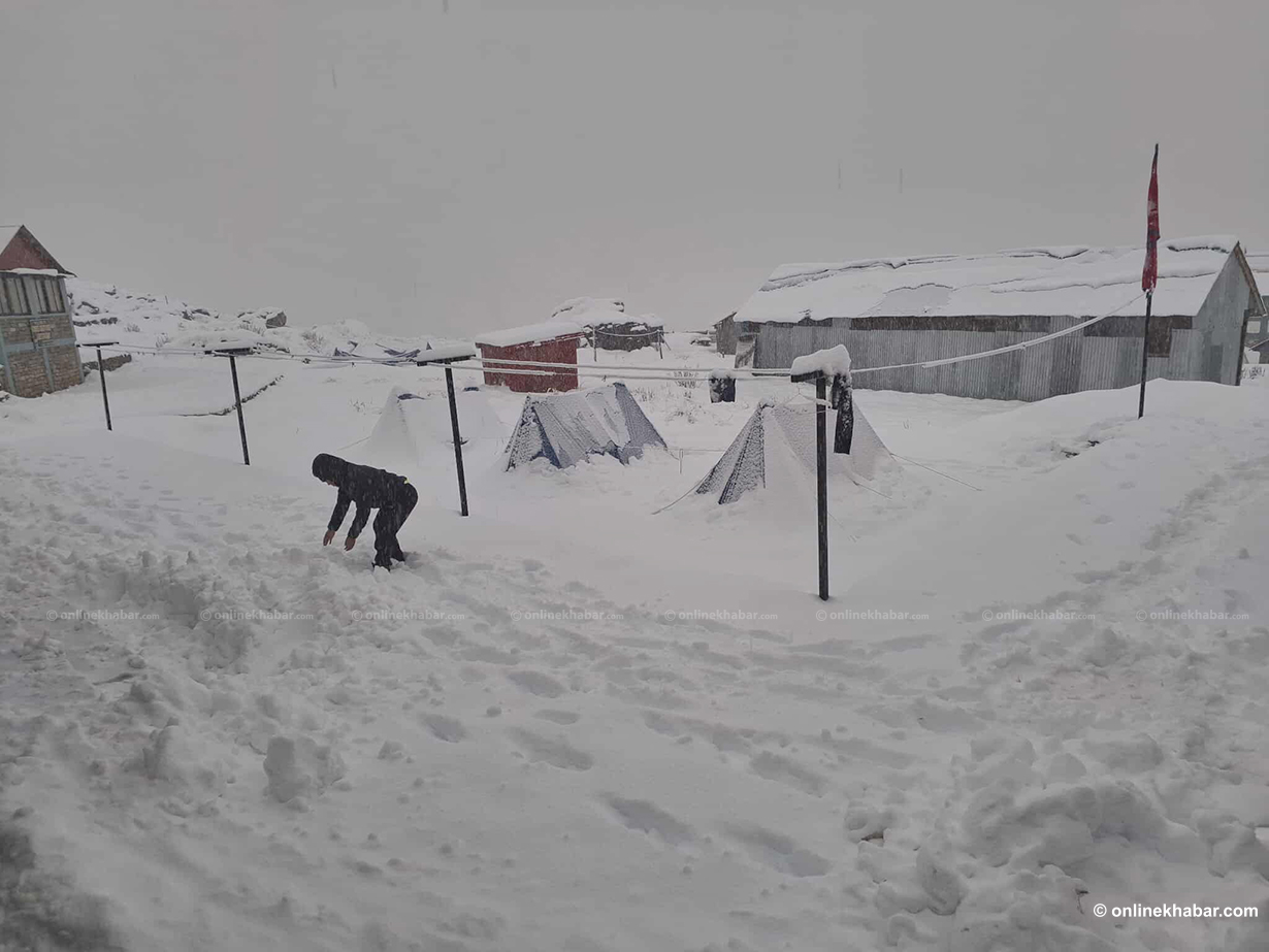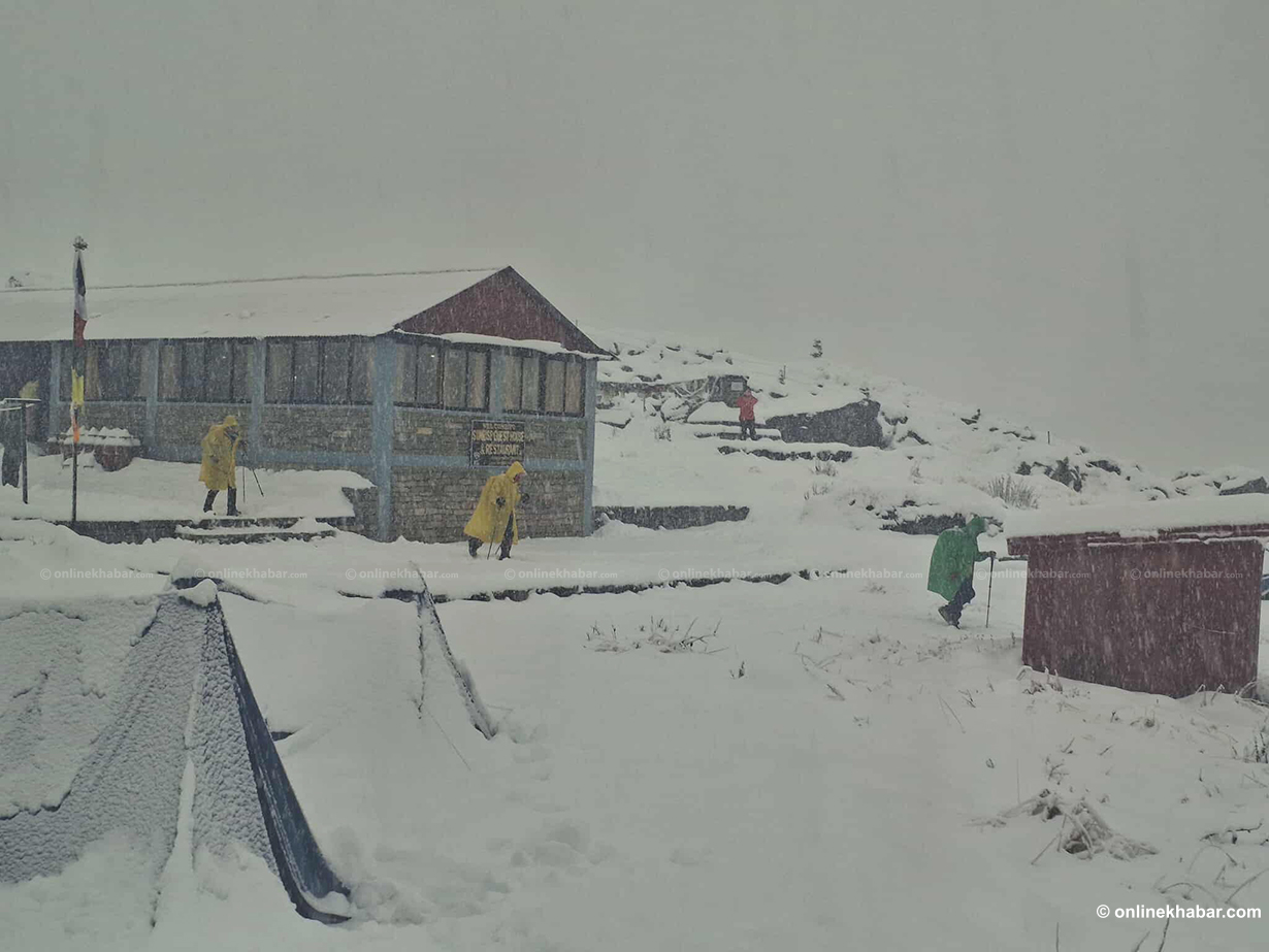 ११ कात्तिक, काठमाडौं । अन्नपूर्ण बेसक्याम्प क्षेत्रमा गएरातिदेखि बाक्लो हिमपात भइरहेको छ ।