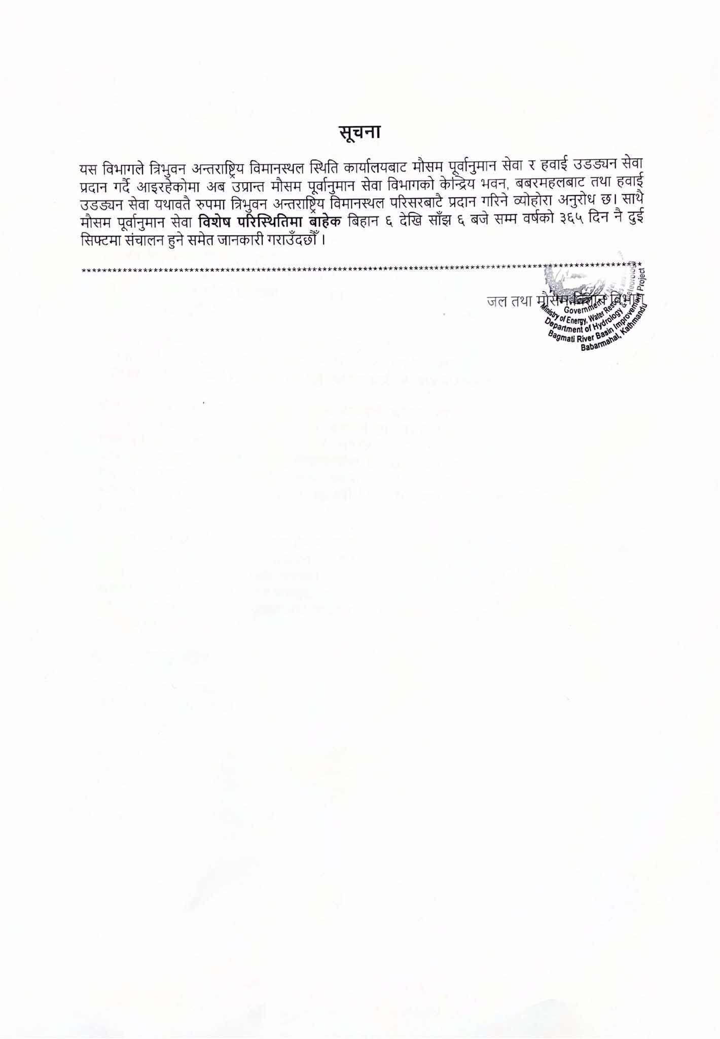 यद्यपि नदी सतह सतर्कता तहसम्म पुग्नसक्ने भएकाले नदी तटीय क्षेत्रमा बसोवास गर्ने नागरिकलाई शतर्क रहन उनले आग्रह गरे । मधेश र कोशी प्रदेशका पहाडी तथा चुरे क्षेत्र भएर बग्ने स–साना खोला–नालामा भने तीव्र बहावको सम्भावना रहेको उनले बताए ।