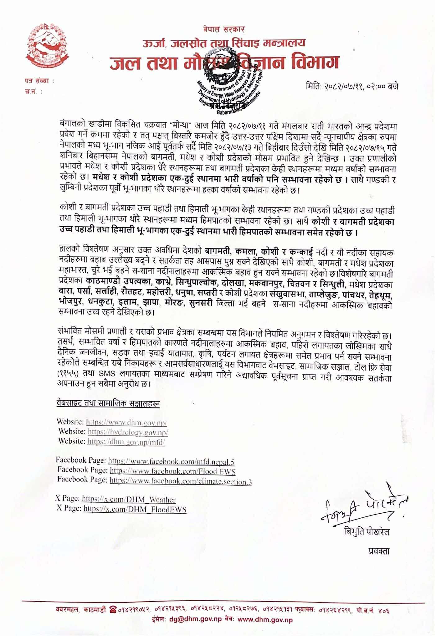 ‘बंगालको खाडीमा ‘मोन्था’ नाम गरेको सामुन्द्रिक चक्रवात विकास भएको छ । त्यो चाहीँ विस्तारै भारतको भूभागमा प्रवेश गरेको छ । विशाखपटनम क्षेत्रमा आजको दिनमा अवस्थित छ र यो अबको दुई दिनमा नेपाल प्रवेश गर्ने देखिन्छ,’ पराजुलीले भने ।